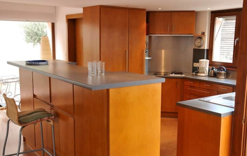 Le bar offre une vue de carte postale sur les toits de Beblenheim et le Sonnenglanz, le Grand Cru du village. La cuisine équipée est ouverte sur le bar et la table d’hôtes. (Equipement cuisine: frigo, micro-ondes, lave vaisselle, four, cuisson électrique & gaz, hotte aspirante).