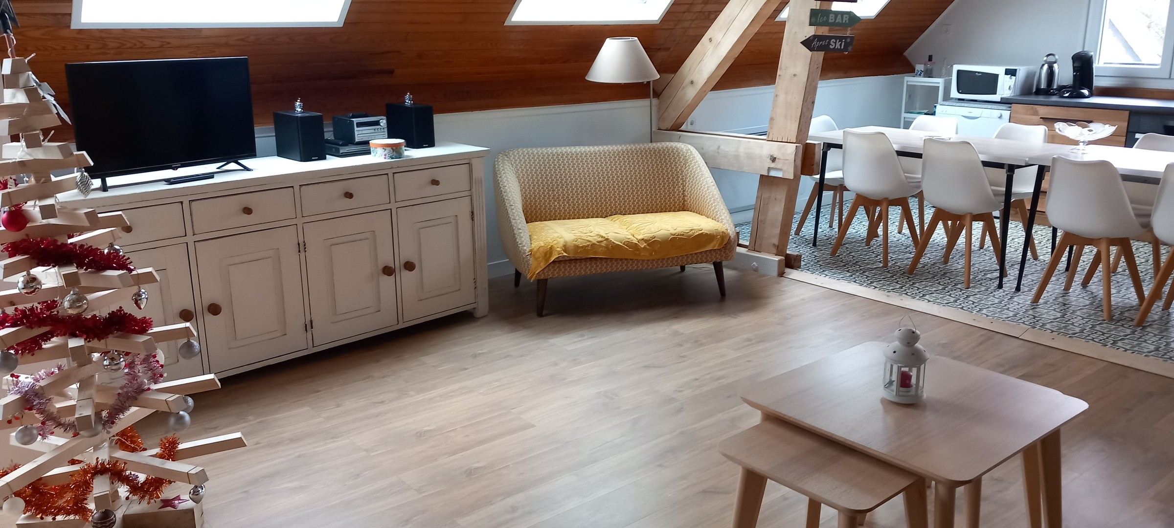 - cuisine ouverte : toute équipée ( lave vaisselle ; table de cuisson 5 feux, four ; machine a café ; micro onde ; TV ; appareil a raclette ; fondue ; grille pain etc...)