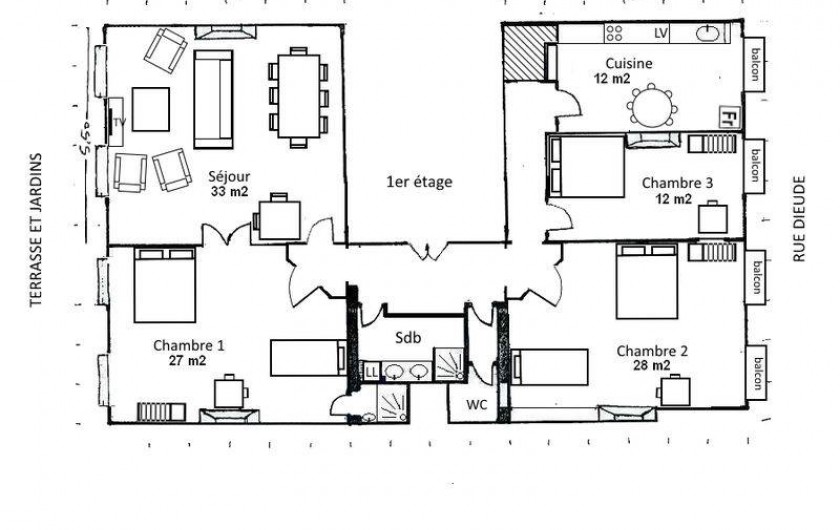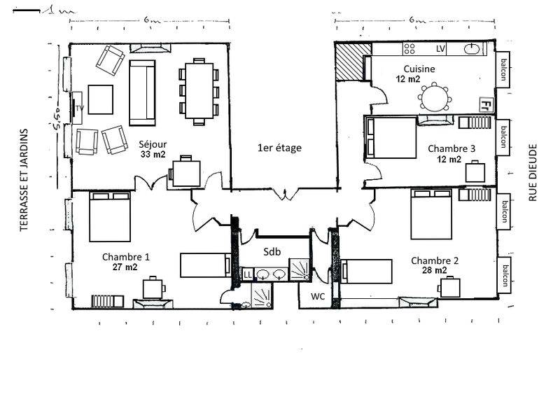 Au 1er étage par un large escalier, l’appartement de 133 m2 occupe tout le niveau. Fenêtres au nord sur la rue Dieudé (calme) et au sud sur cours et jardins.
