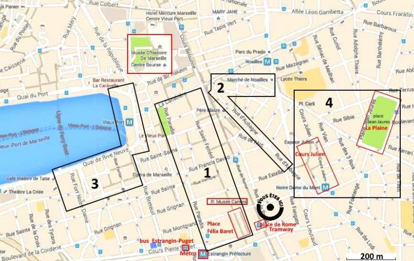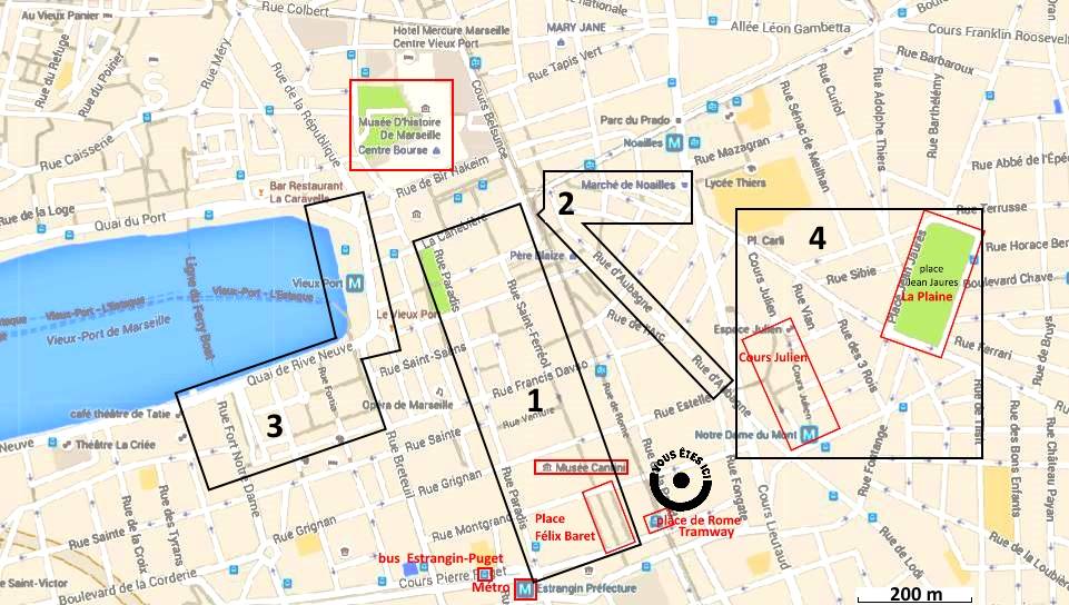 4. Ambiance branchée façon Marseille : du Cours Julien (le « Cours Ju ») à la place Jean Jaurès : restaurants et bars, petites rues, petites boutiques, bons artisans. Marchés du cours Julien et de la Plaine.