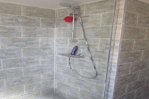 Salle de bain: douche à l'italienne, lavabo, rangements.