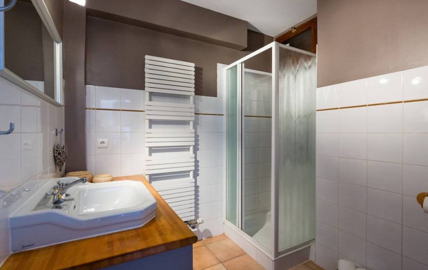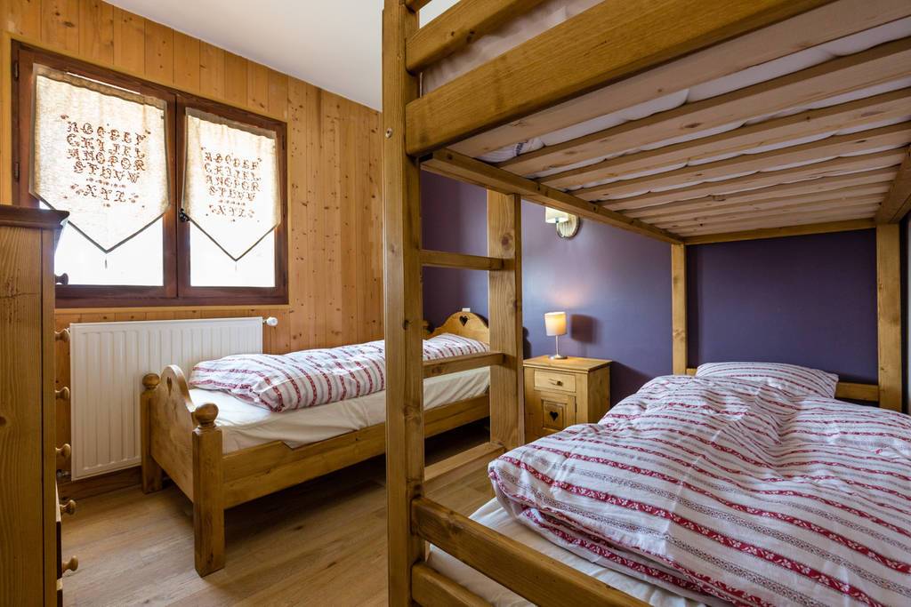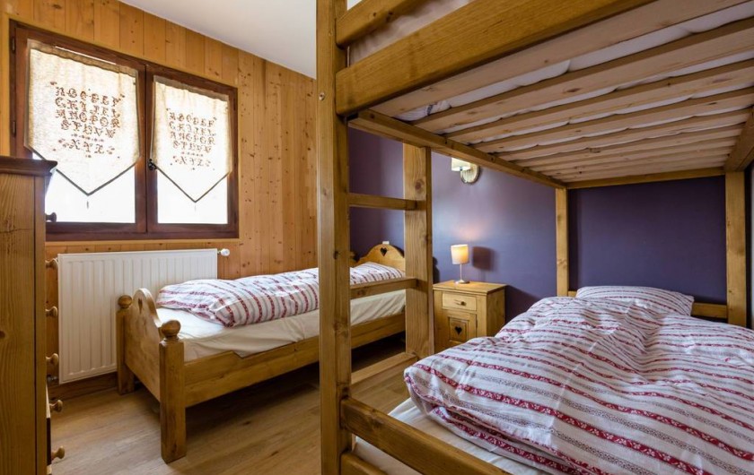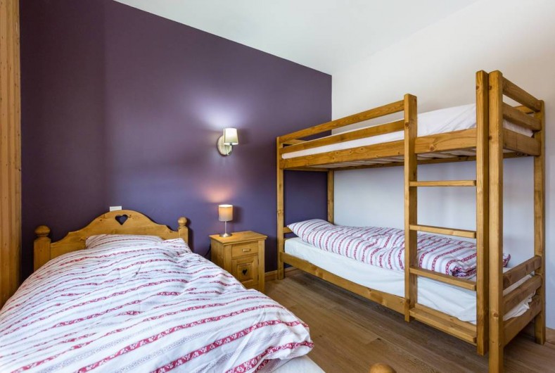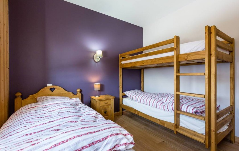 une chambre à coucher pour 2 personnes avec un lit double, une chambre à coucher pour 3 personnes, avec un lit simple et 2 lits superposes et une salle de bains avec douche et toilettes.