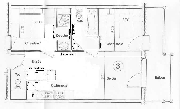 Chambre 2 : 2 lits tapissiers pouvant être écartés l'un de l'autre ou rapprochés pour en faire un lit double de 160cmx195cm. Cette chambre a une salle de bain attenante équipée d'une baignoire, évier, wc sèche serviette et sèche cheveux.