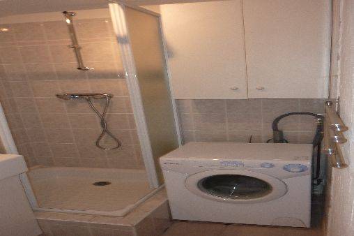 la salle de bains,avec la douche,la machine à laver le linge, une armoire, lavabo,