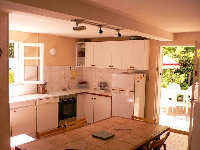 L’équipement de la cuisine comprend évier, placards, cuisinière (four électrique), four micro-onde, lave-vaisselle, cafetière électrique, bouilloire électrique.