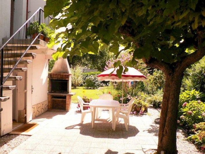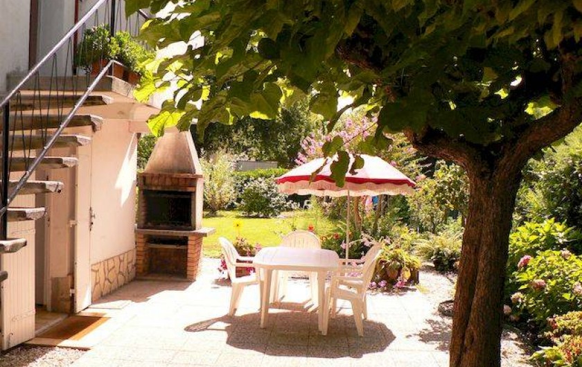 Sur l’espace terrasse situé devant la porte d’entrée, dont une partie est ombragée par un catalpa, il y a un barbecue, une table, des fauteuils, et des parasols.