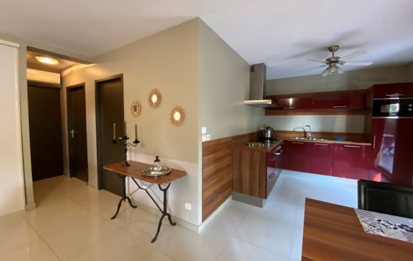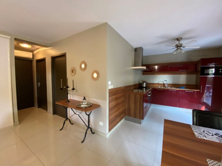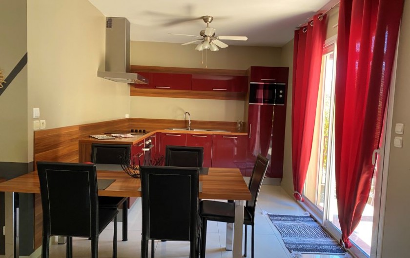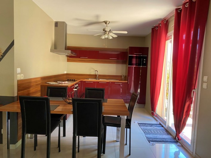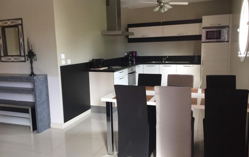 Cuisine intégrée toute équipée : grande table avec 6 chaises, lave- vaisselle, four, four micro- ondes, table de cuisson réfrigérateur congélateur,