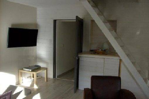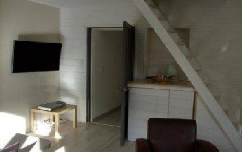 Salon avec cuisine équipée (plaque induction, micro-ondes, four, lave-vaisselle, frigo, cafetière). Canapé-lit tout