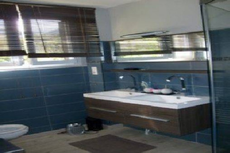 Salle de bains douche à l'italienne, double vasques, sèche serviettes + wc.