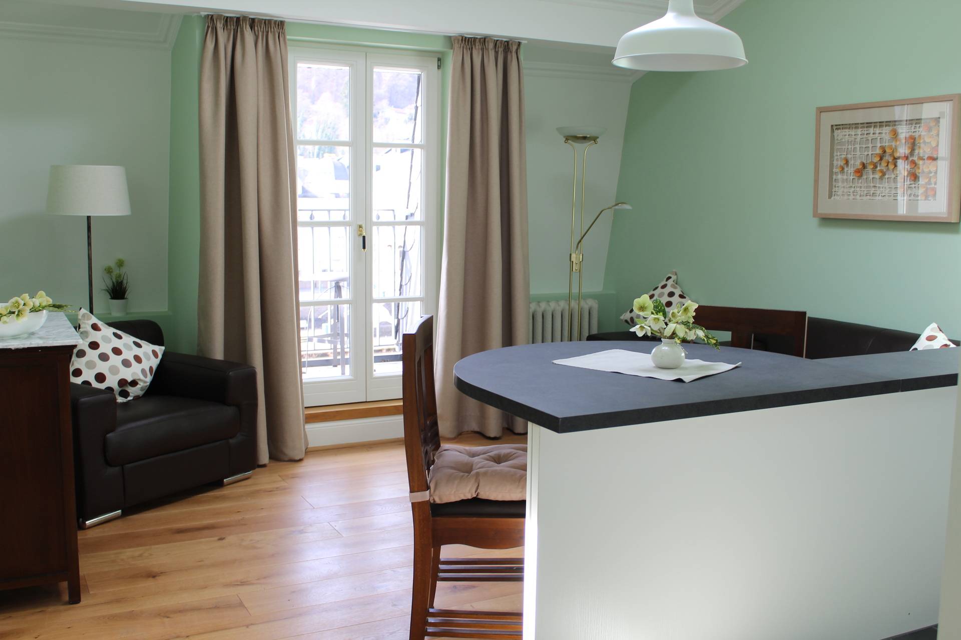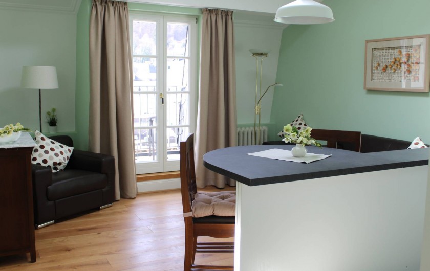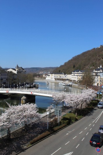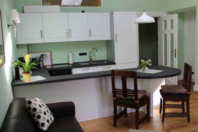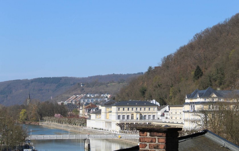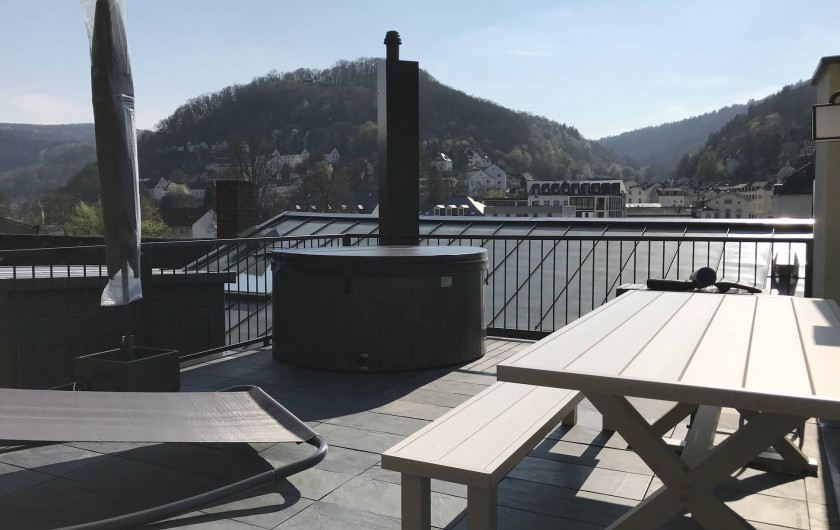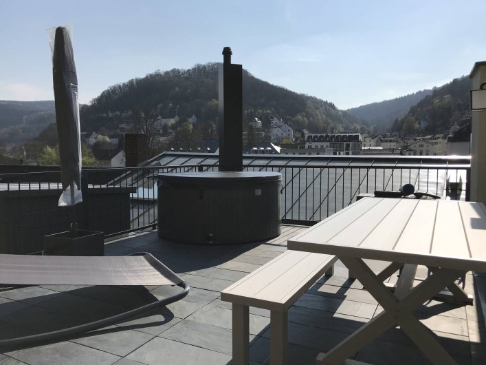 Appartement mansardé luxueusement meublé avec 1 chambre à coucher, salle de bain, séjour avec coin cuisine et loggia donnant sur la rivière et le centre thermal. La chambre à coucher est équipée d'un lit à sommier et d'un linge de lit en coton doux pour la peau. Serviettes, peignoirs et serviettes de bain sont fournis. De la chambre à coucher, il y a un accès exclusif à la terrasse sur le toit en pierre avec jacuzzi, divan à bascule, grill, vue fantastique sur le centre thermal de Bad Ems et sur le massif rocheux de la maison. A côté de l'appartement, vous pouvez réserver