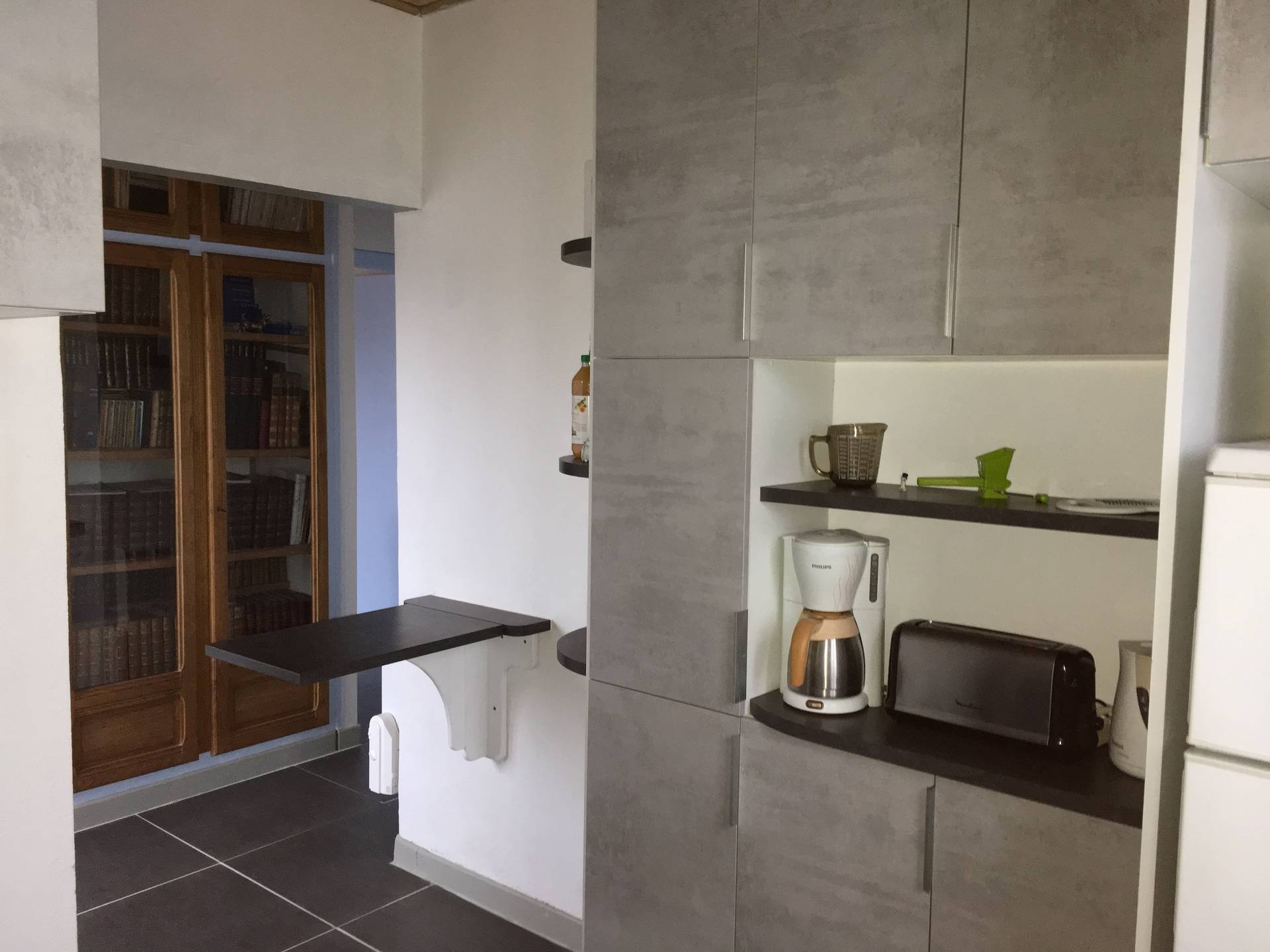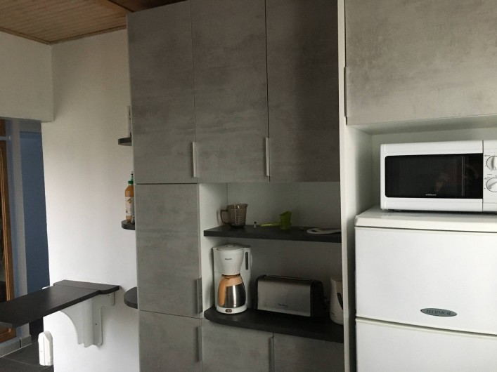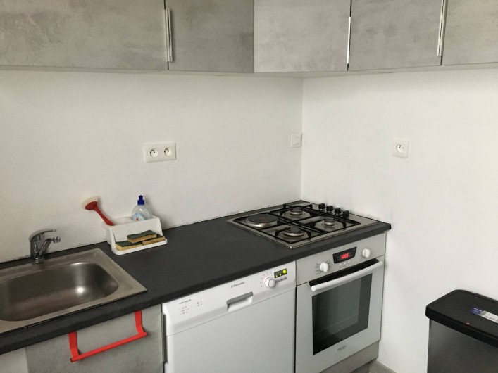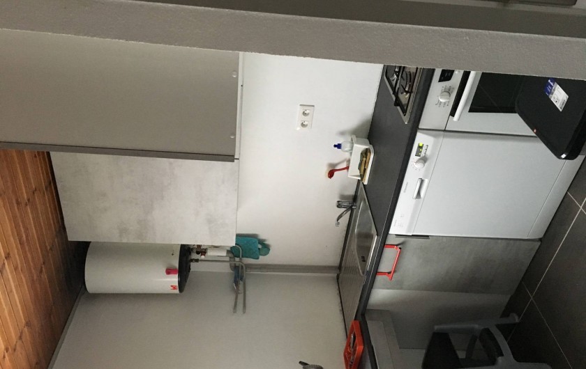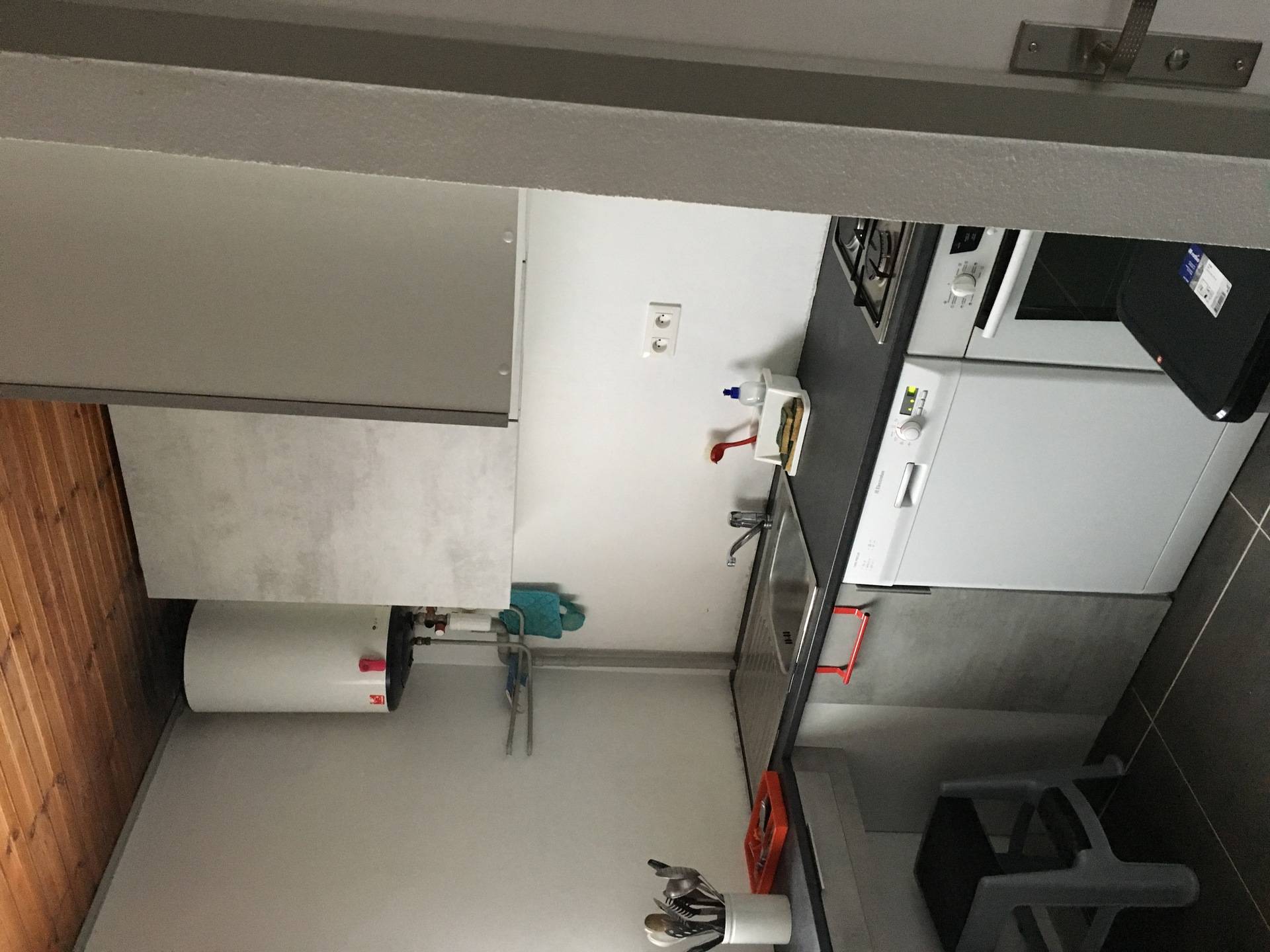La cuisine avec l'électroménager intégré, (plaque de cuisson mixte, four électrique, lave-vaisselle, frigo/congélateur, machine à laver le linge) dispose de nombreux placards.