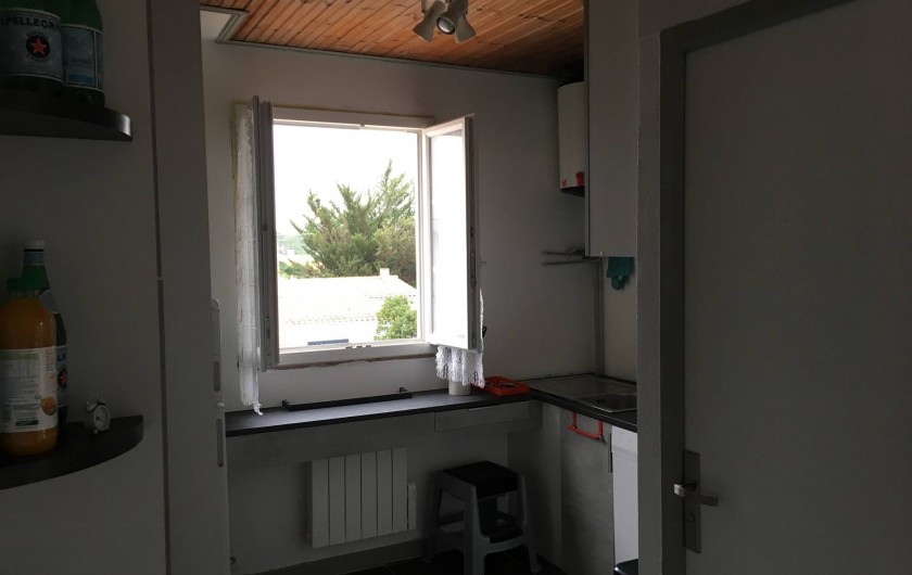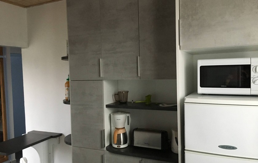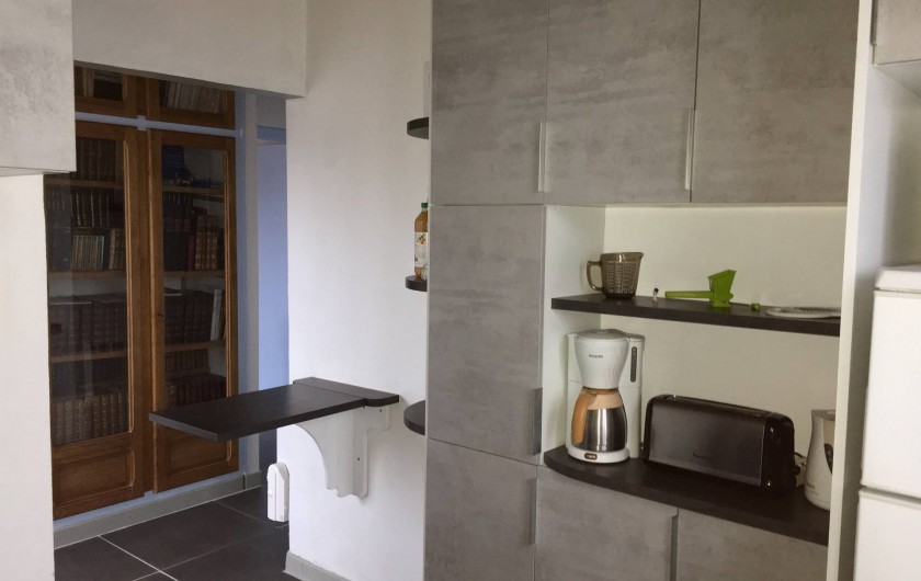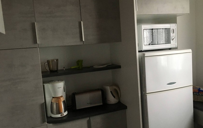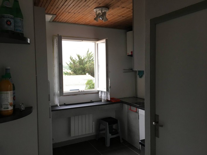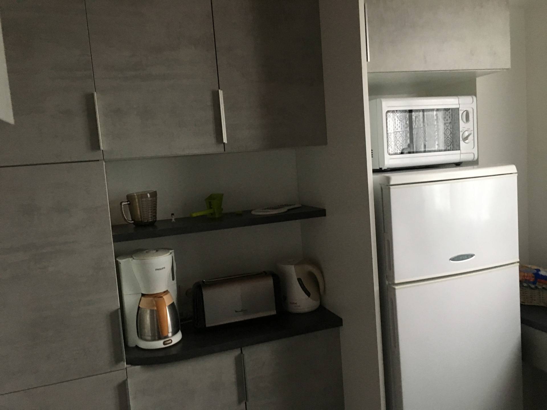 La cuisine avec l'électroménager intégré, (plaque de cuisson mixte, four électrique, lave-vaisselle, frigo/congélateur, machine à laver le linge) dispose de nombreux placards.