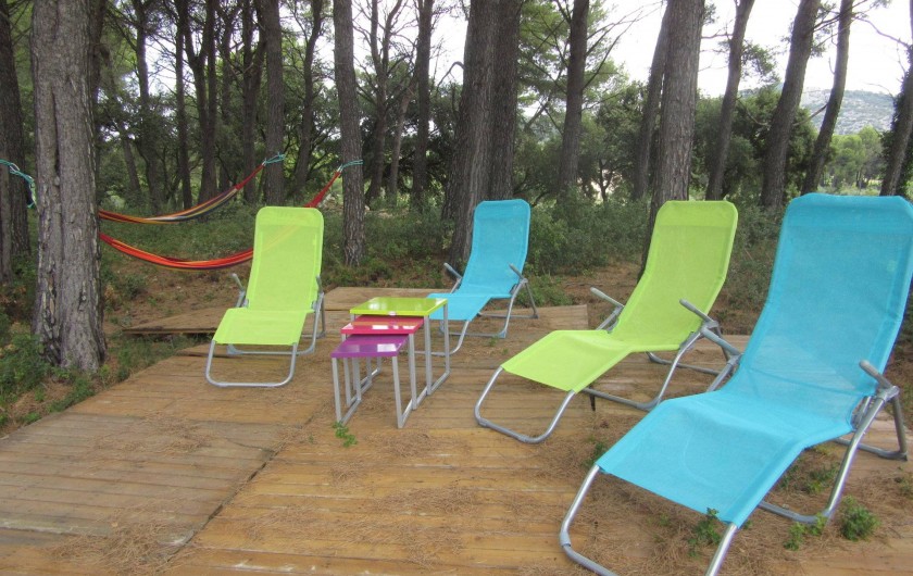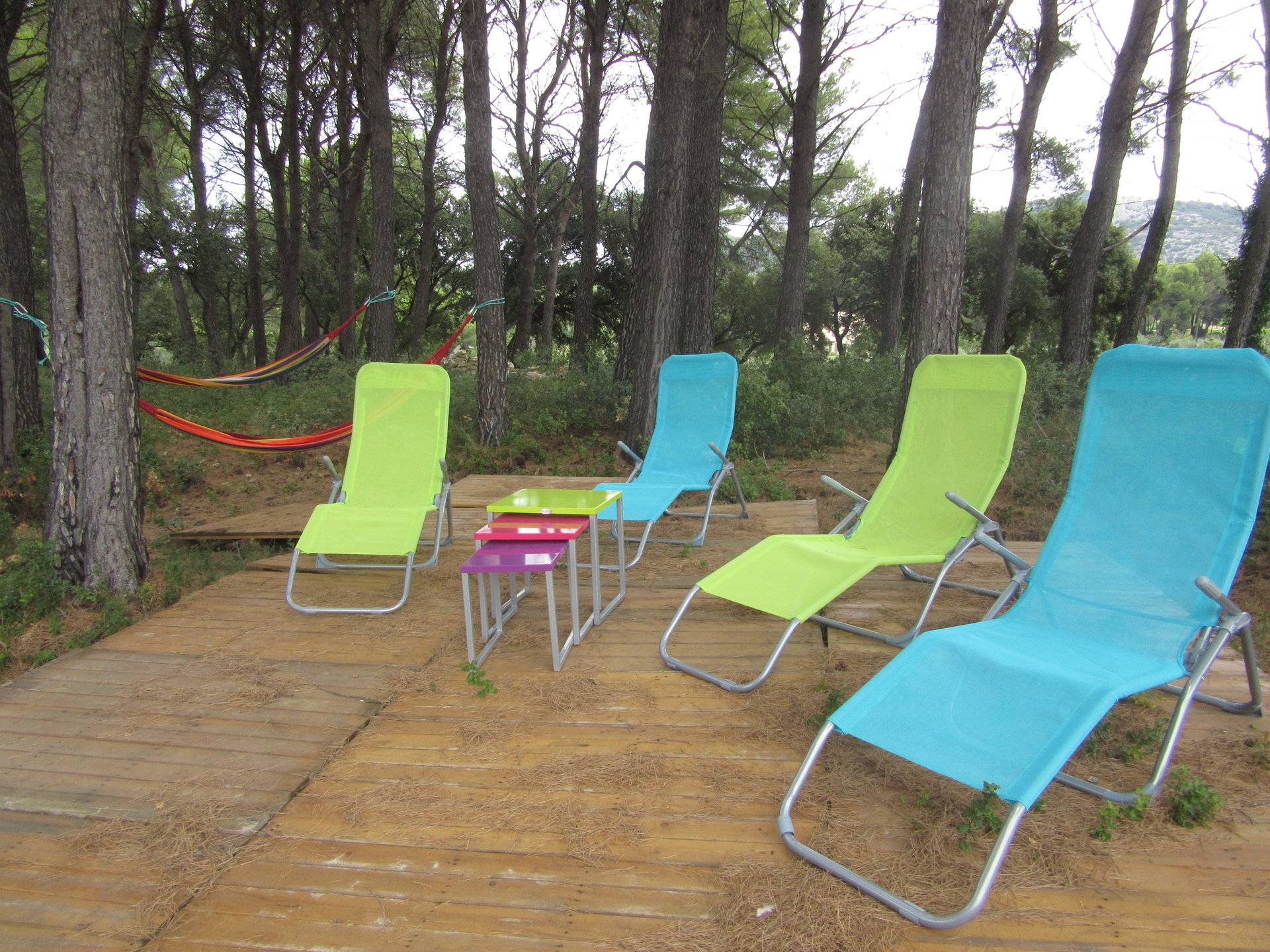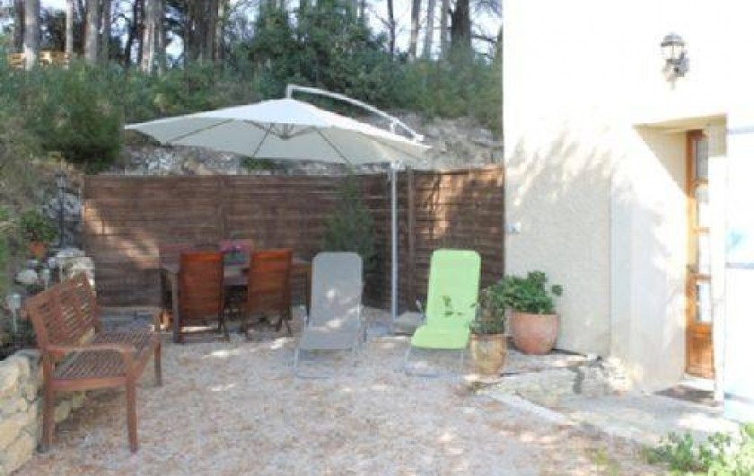 L'EXTÉRIEUR, UN SALON DE JARDIN ET BARBECUE ELECTRIQUE, CHAISES LONGUES ET PARASOL.