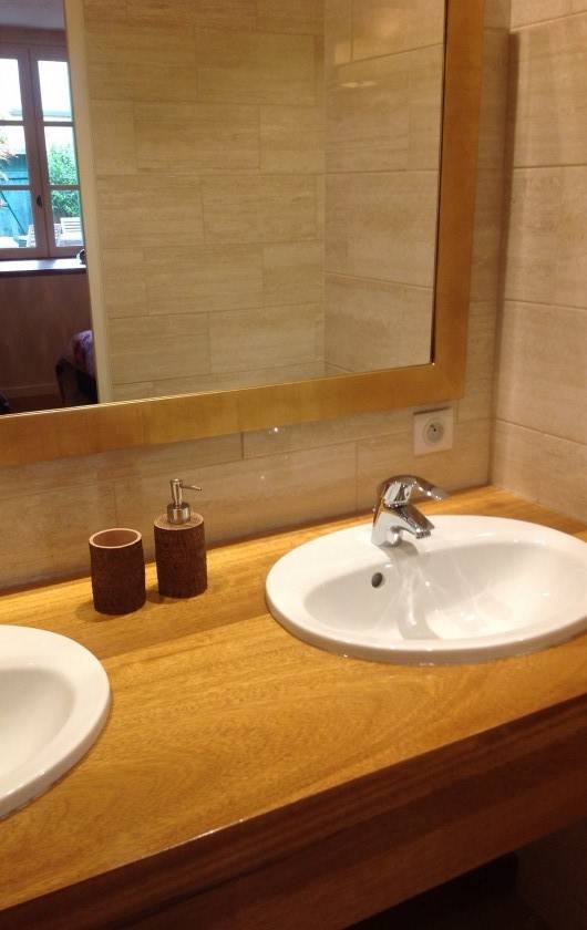 Une chambre avec un lit 160x 200cm, une douche italienne. Une chambre avec un lit 2 places et 2 lits superposés , une salle de bain avec une baignoire spa et un lavabo double vasque.