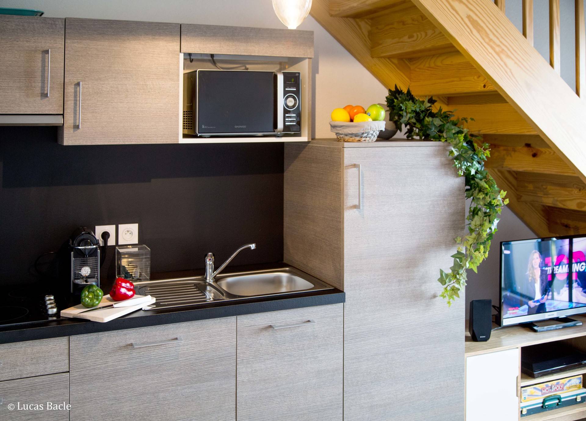 2 chambres, une cuisine équipée (lave vaisselle, plaque, hotte, grand frigo) une