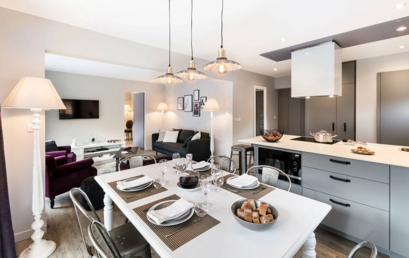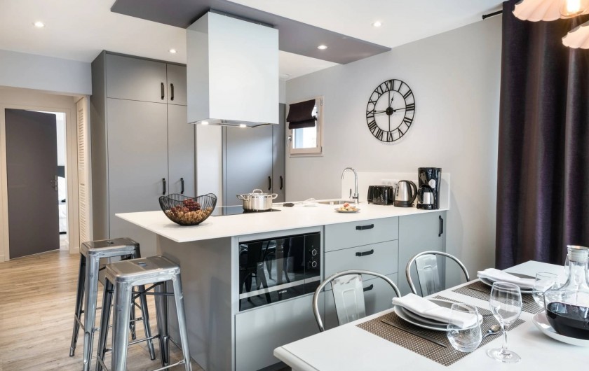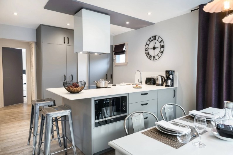 Cuisine exposée Sud-Est, entièrement équipée avec lave-vaisselle, lave-linge/sèche-linge, micro-ondes, four, réfrigérateur avec compartiment congélateur, cafetière filtre, machine à café Dolce Gusto, îlot central comprenant plaques vitrocéramiques 4 feux, une hotte aspirante etc… (inventaire complet sur demande).