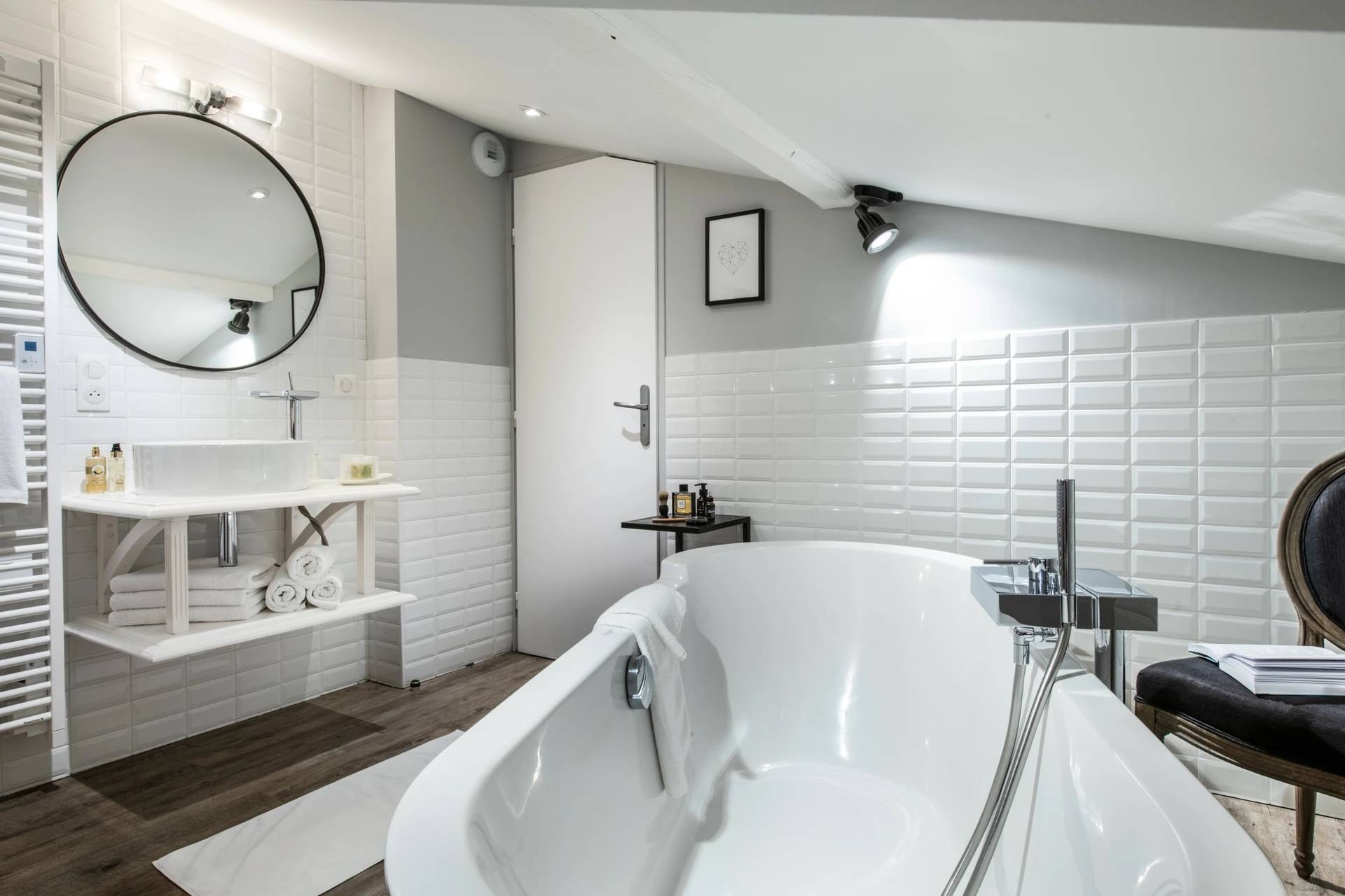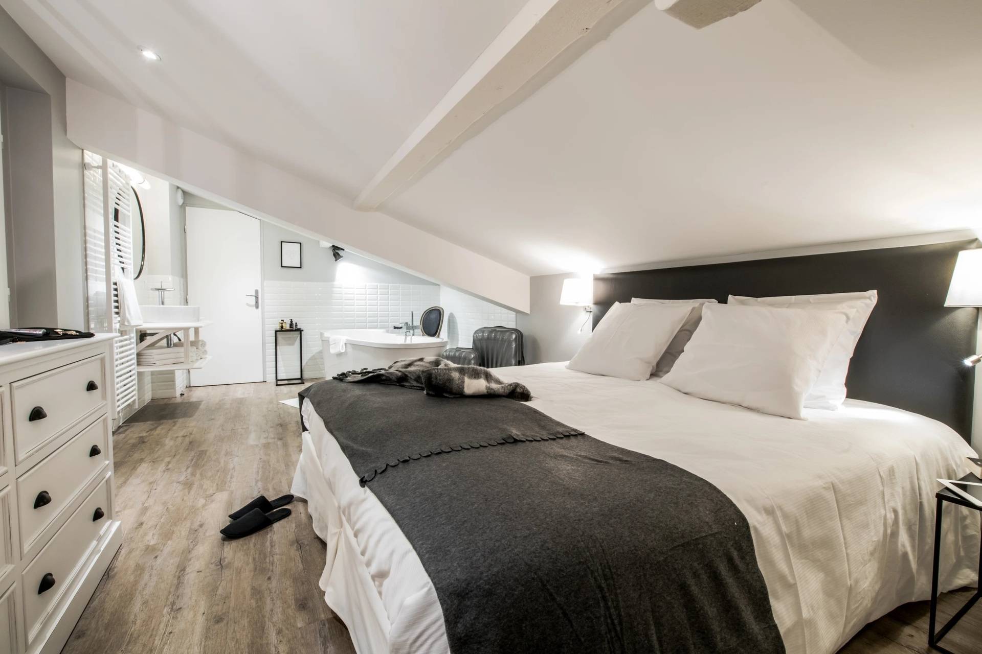 • Une suite mansardée avec sa terrasse exposée Est ; comprenant un lit double 180 x 200 cm composé de deux lits 90cm vous laissant le choix de rapprocher ou non les lits, TV écran plat, une salle de bains ouverte sur la chambre avec toilettes privatives séparées