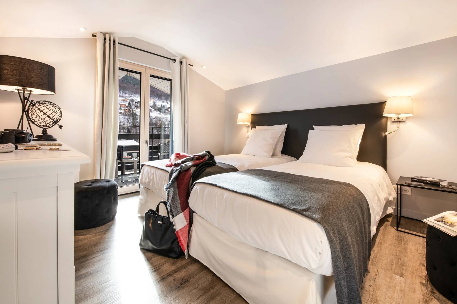 • Une chambre double avec son balcon exposé Sud composée d'une entrée dressing, une salle de douche à l'italienne, des toilettes privatives, et d'un espace nuit comprenant : un lit double 180 x 200 cm composé de deux lits 90 x 200 cm vous laissant le choix de rapprocher ou non les lits, TV écran plat.