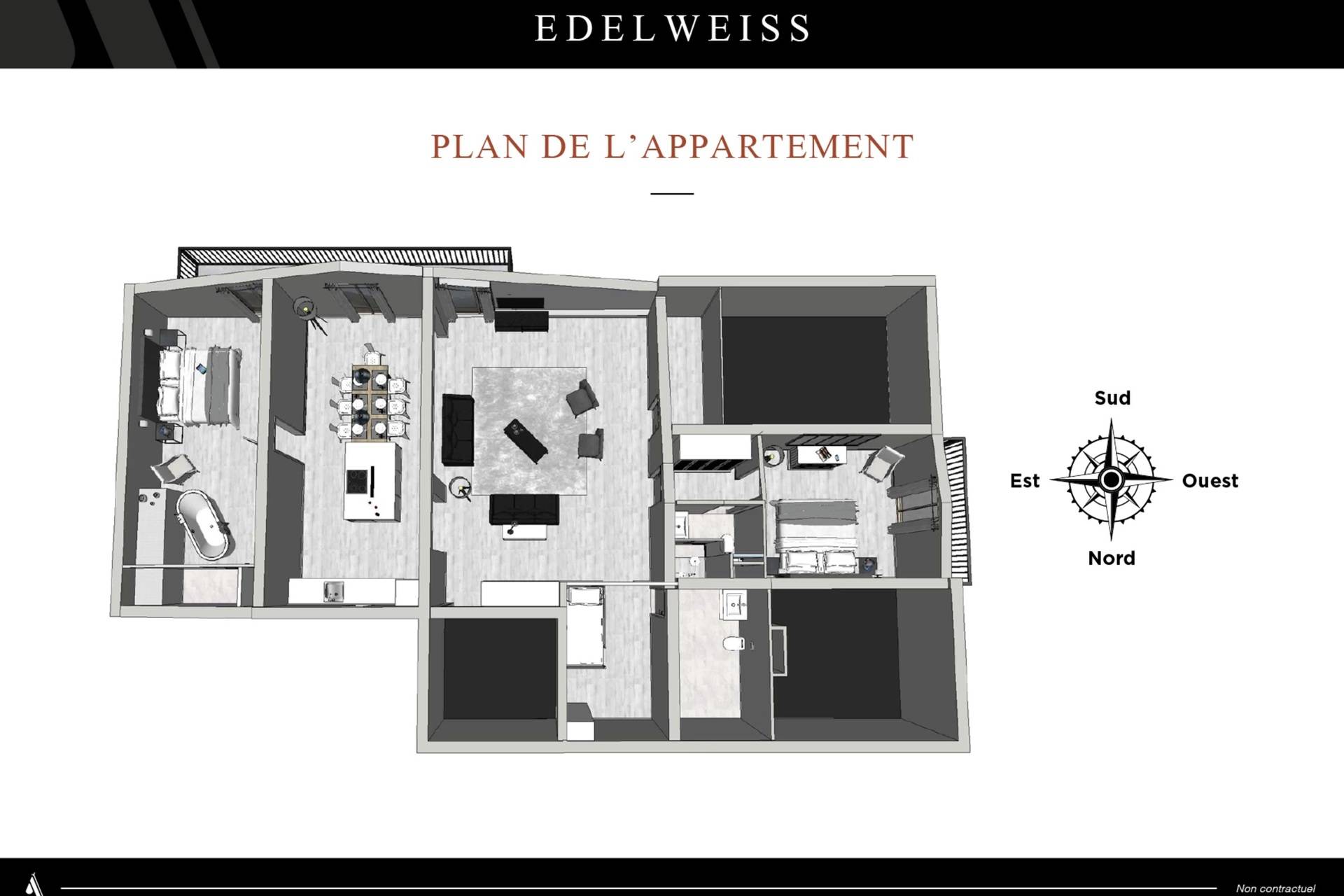 L’appartement Edelweiss est situé au 4ème étage avec ascenseur (ascenseur jusqu’au 3ème étage puis 16 marches) de la Résidence ALTICIMES.