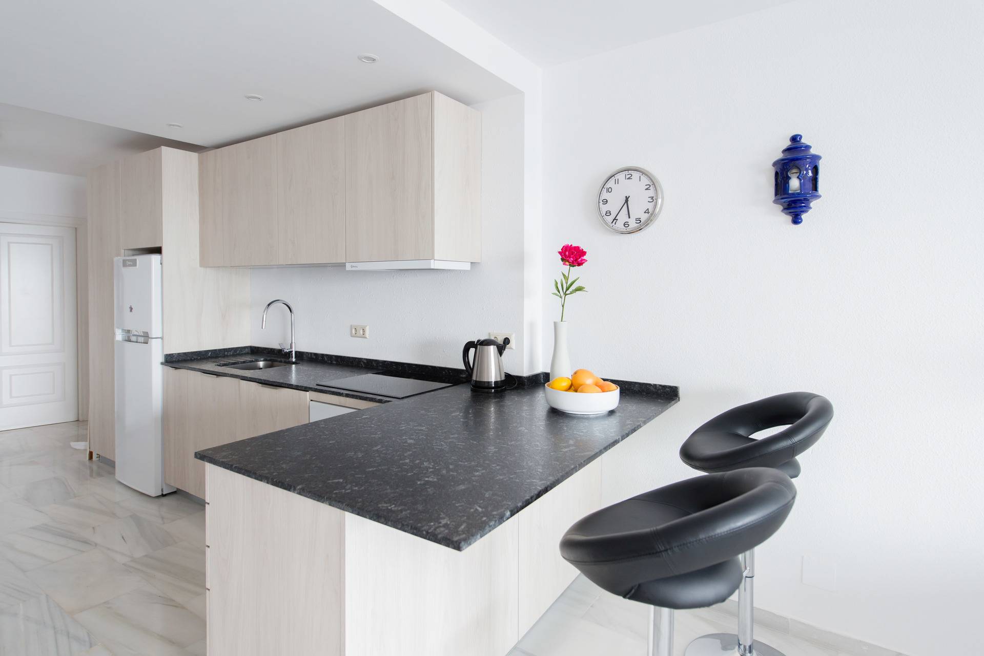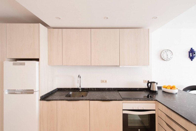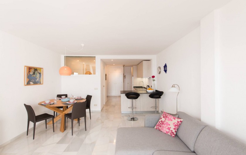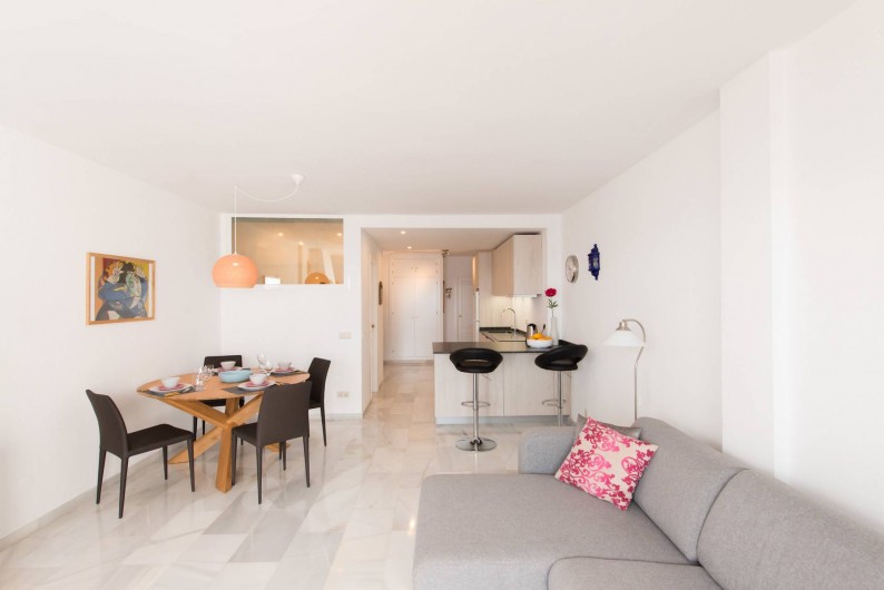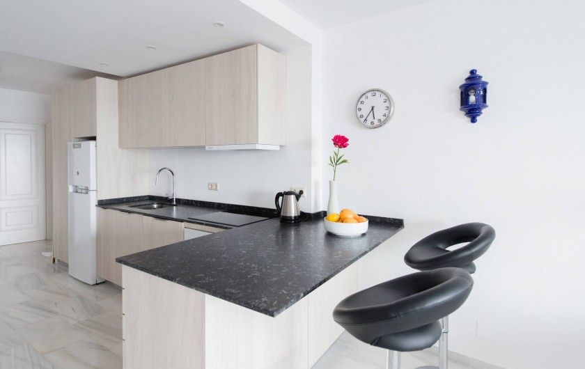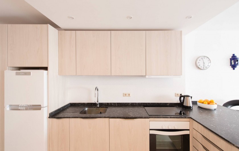L'appartement a été entièrement rénové en Novembre 2016, une nouvelle cuisine spacieuse (four, lave-vaisselle etc.). Maintenant, l'appartement est un grand espace ouvert entre entrée, cuisine, salon et terrasse, qui ouvre l'appartement vers la mer. Par rapport aux appartements typiques espagnols avec de petites chambres cela est une expérience tout à fait différente et spacieuse. Vous pouvez obtenir une impression de cette description sur les photos prises récemment.