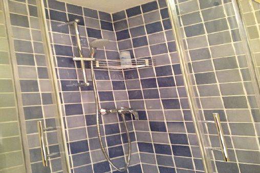 douche spacieuse en carrelage de Salernes, et un coin toilette avec wc.