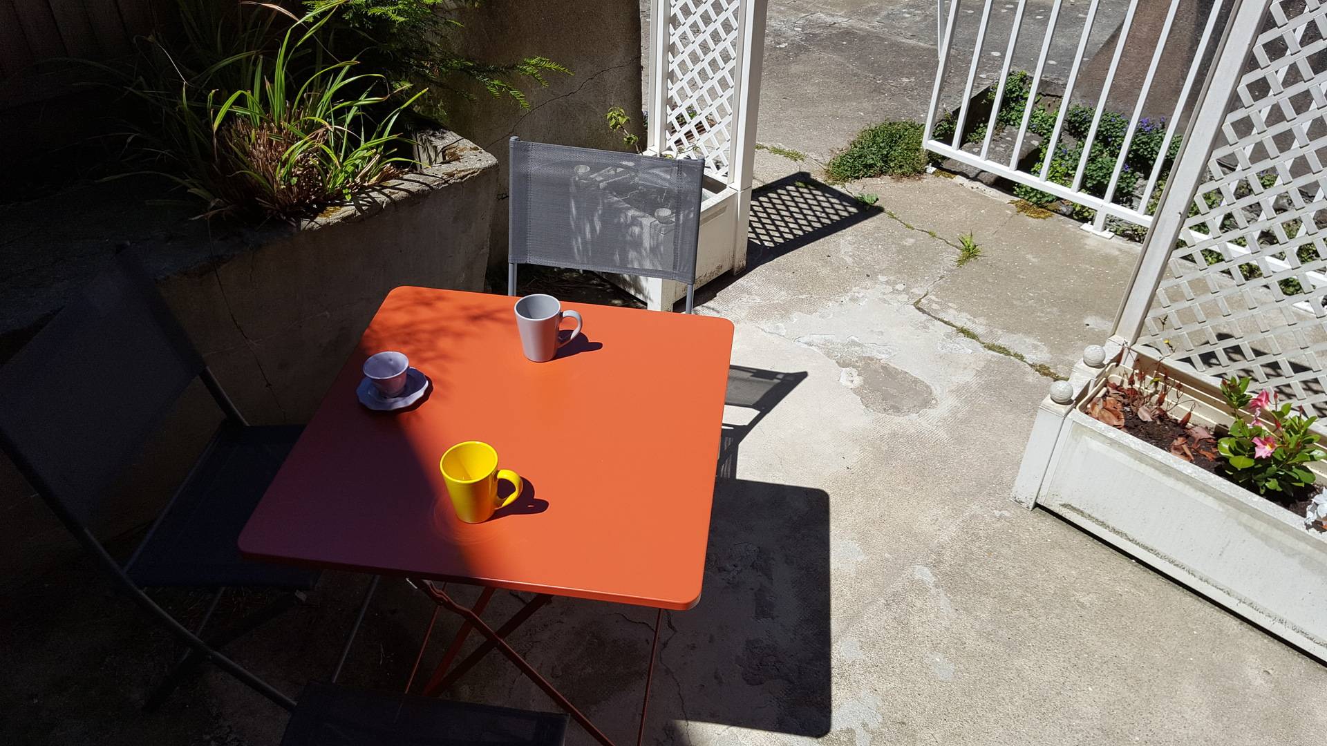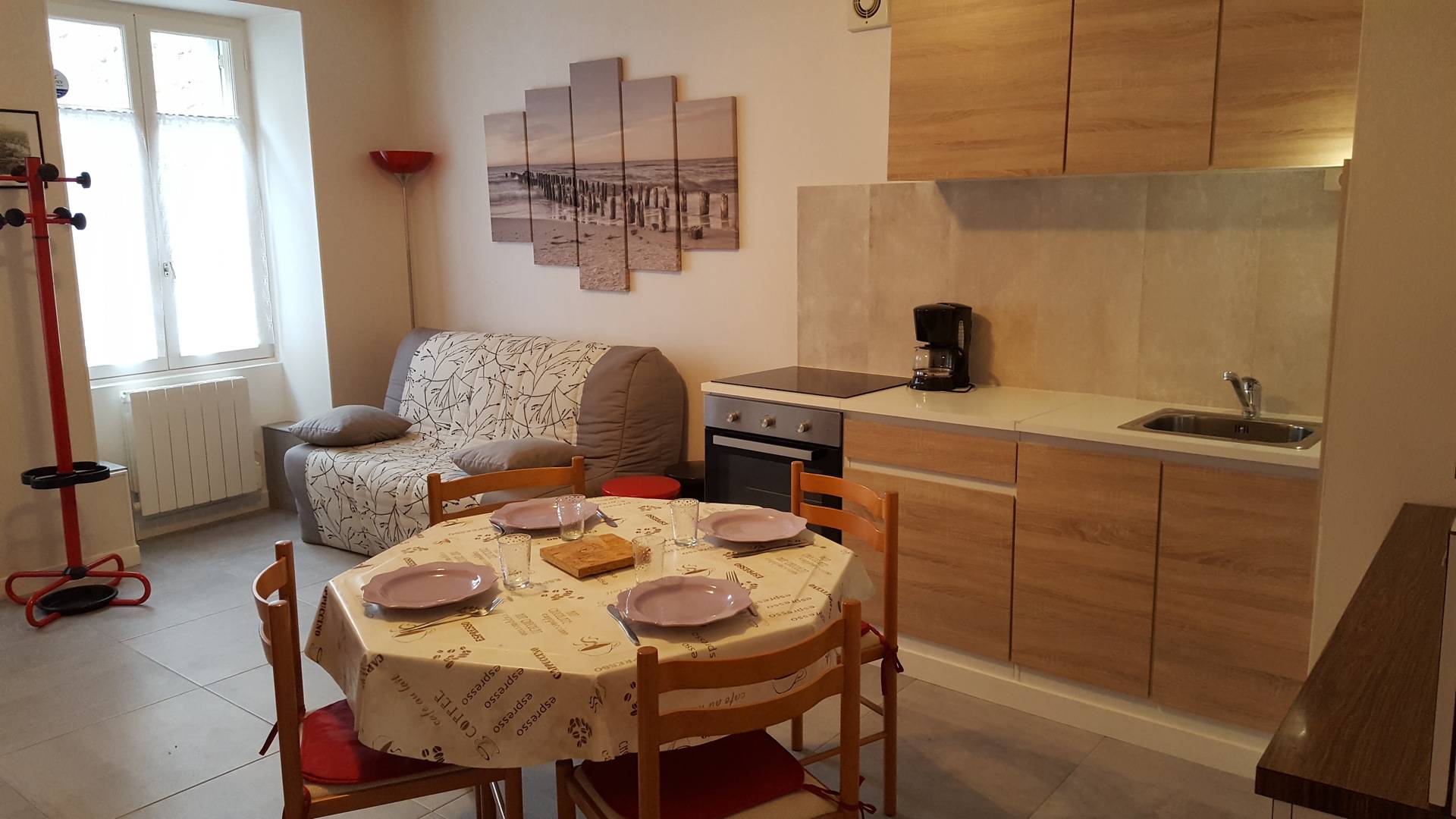 appartement rénové de 35m² en rez-de-chaussée, composé d'un séjour/cuisine avec TV, d'une salle d'eau avec WC, d'une chambre sur cour exposée ouest, d’un salon de jardin.