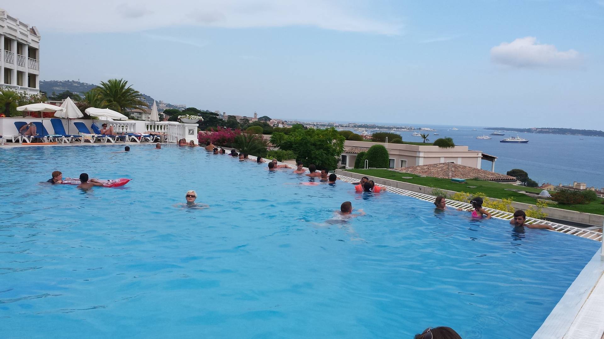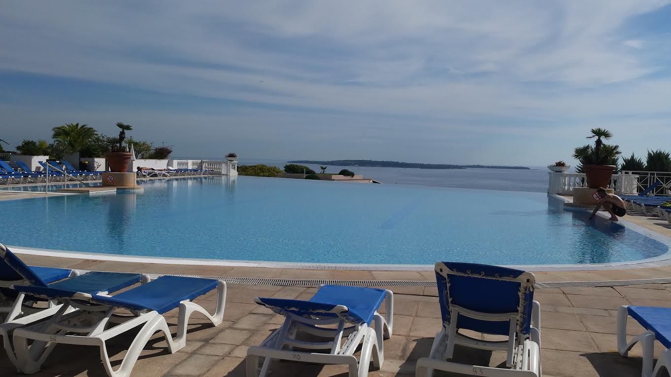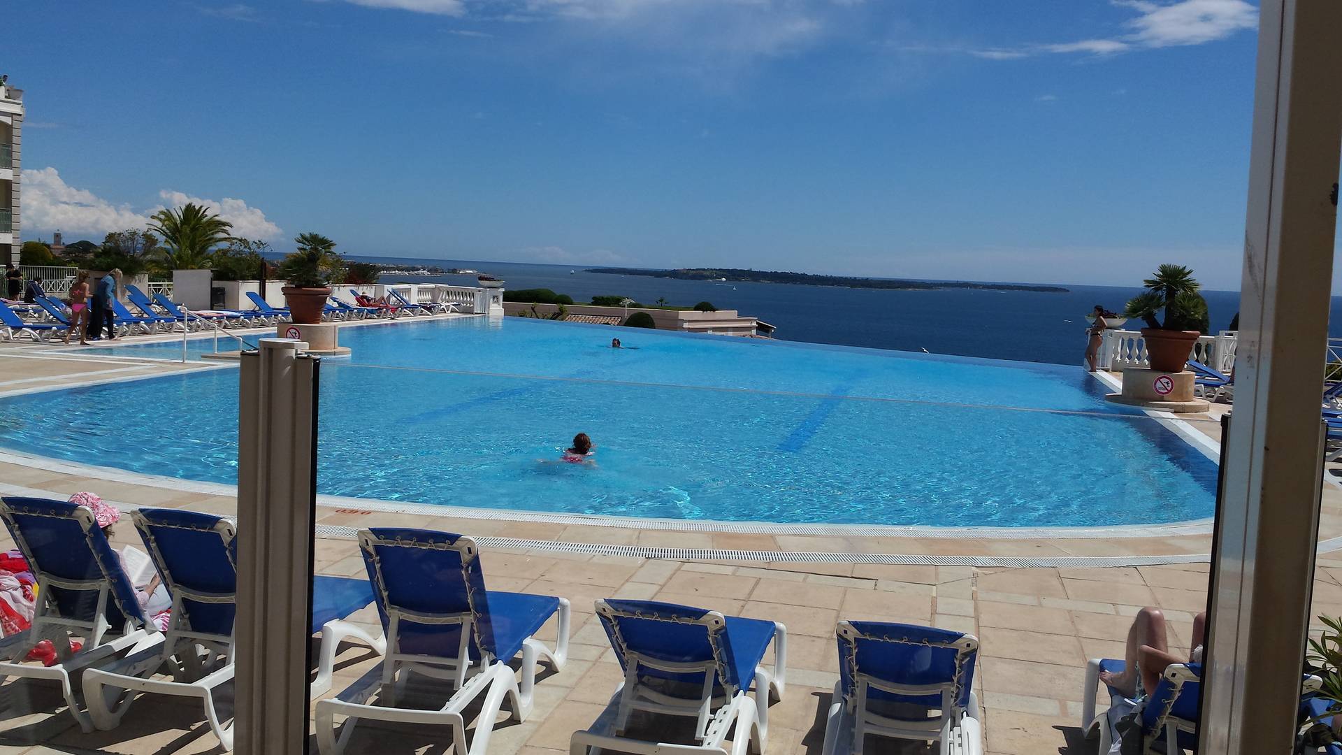 La seconde TRÈS GRANDE à DÉBORDEMENT de 1.100m² ou vous pourrez admirer les îles de Lérins soit en nageant ou à la terrasse du BAR/RESTAURANT ou le petit déjeuné peut être servi.