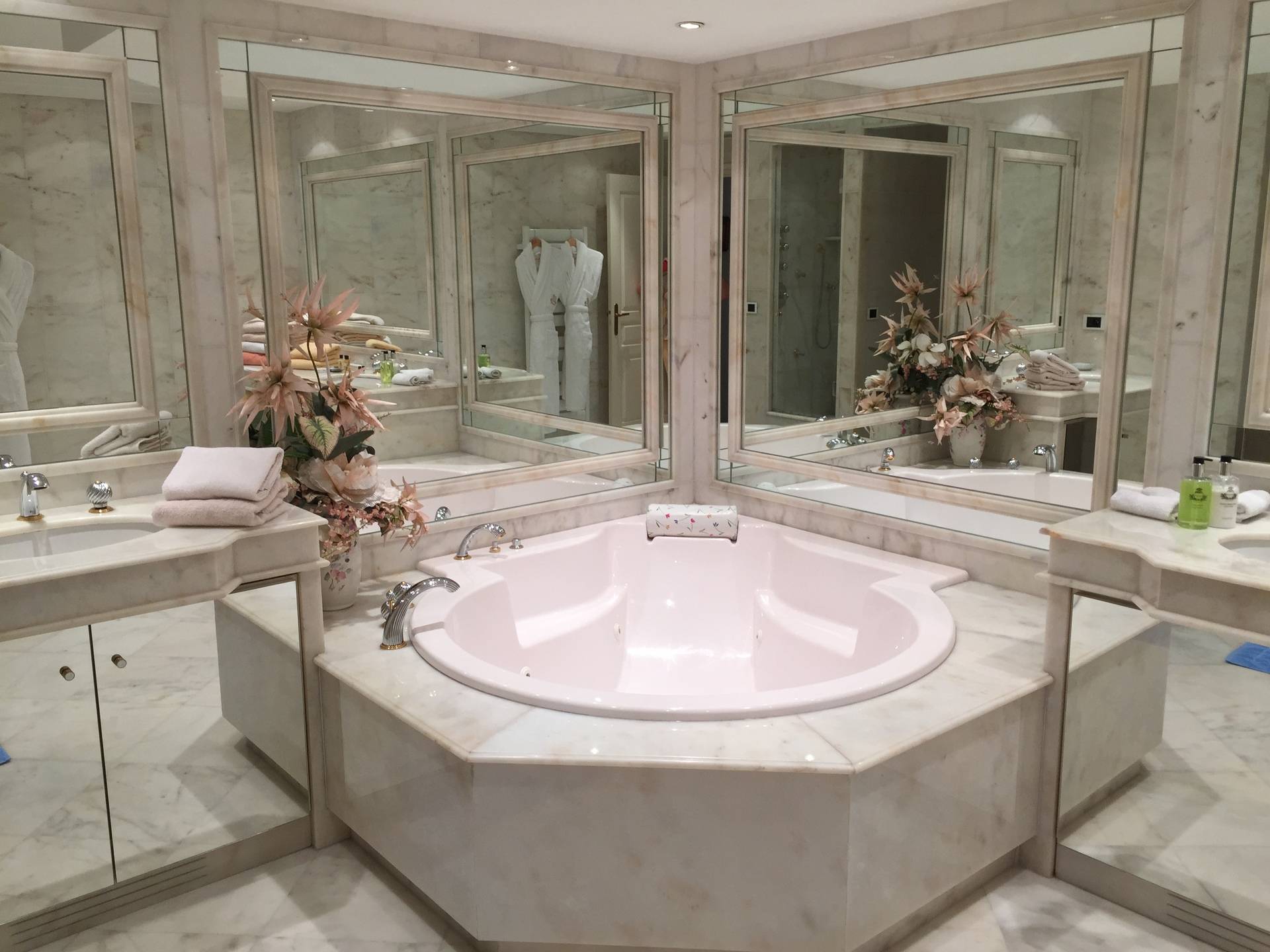 - d'une très grande salle de bain en marbre avec douche et baignoire d'angle et deux lavabos séparés ;