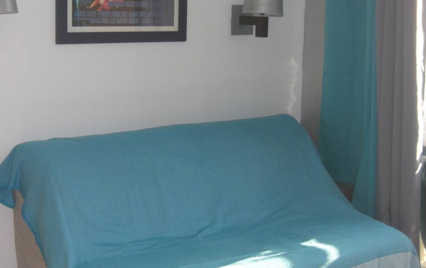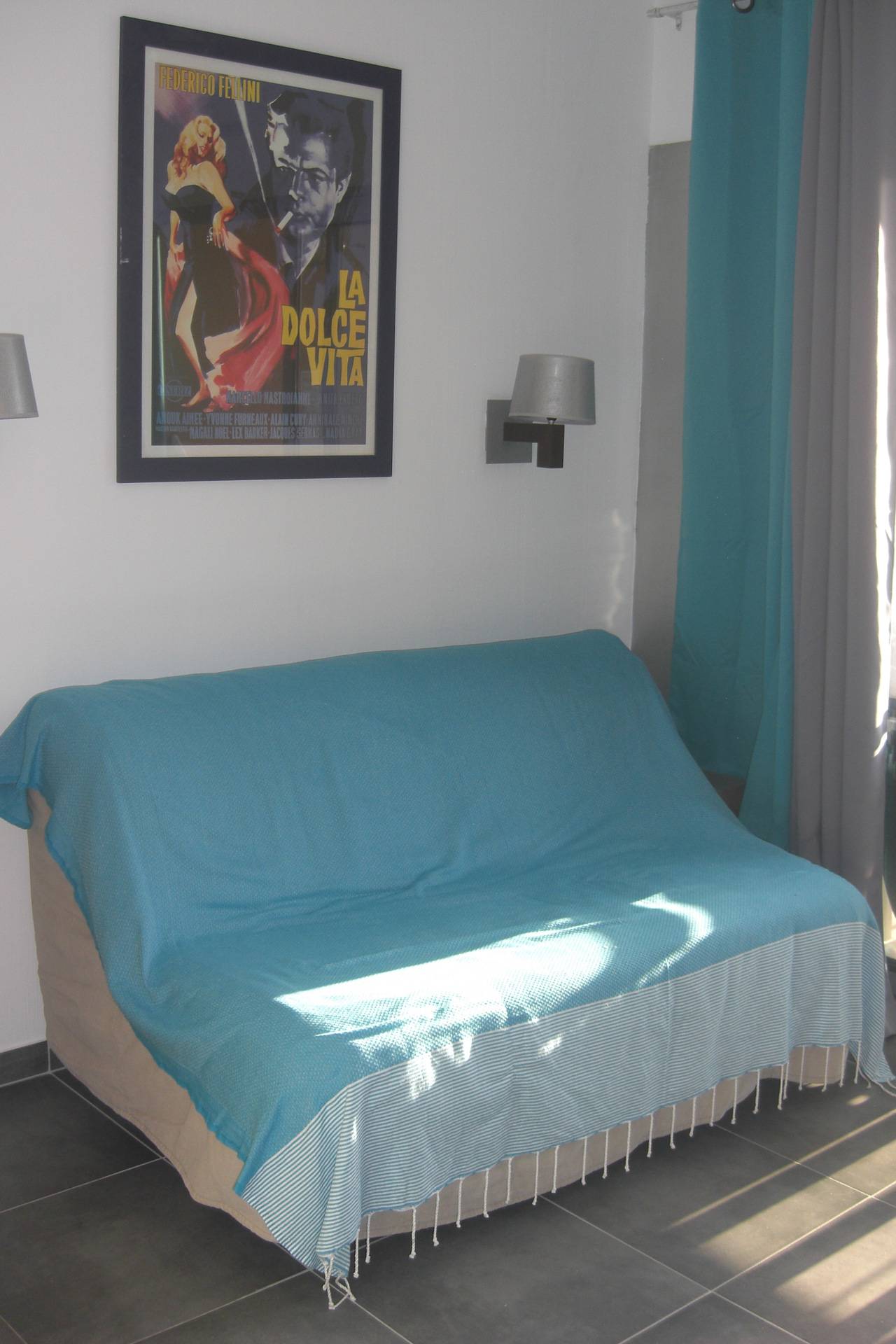 Un salon comprend un convertible 2 couchages une tv et un bureau- console