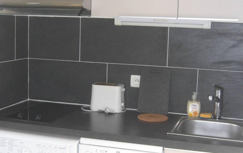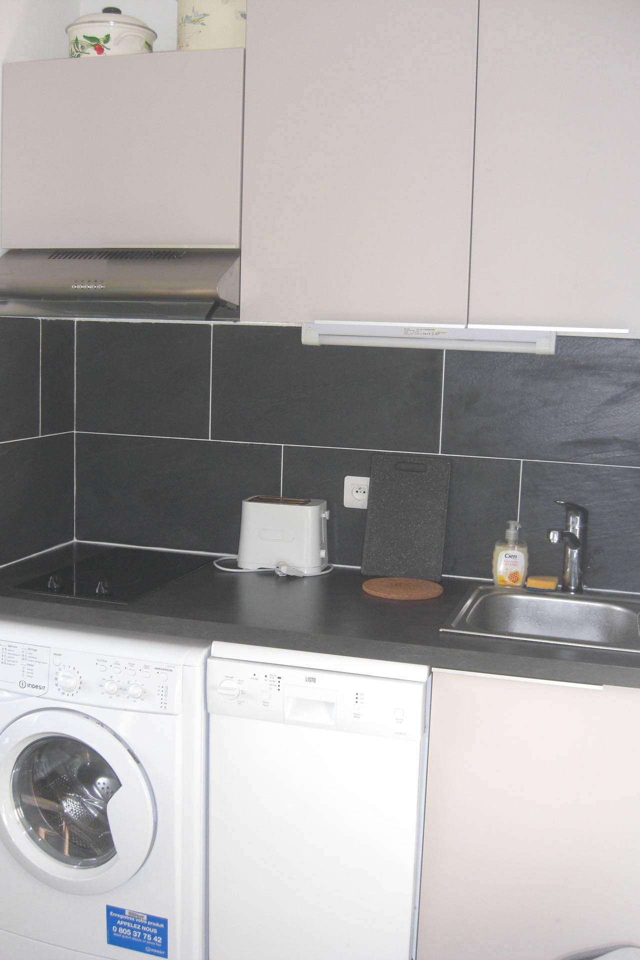 Un sejour kitchenette avec 2 plaques vitro, four micro-onde , frigo - congelateur, lave- linge et lave-vaisselle, placards , une table et 4 chaises.