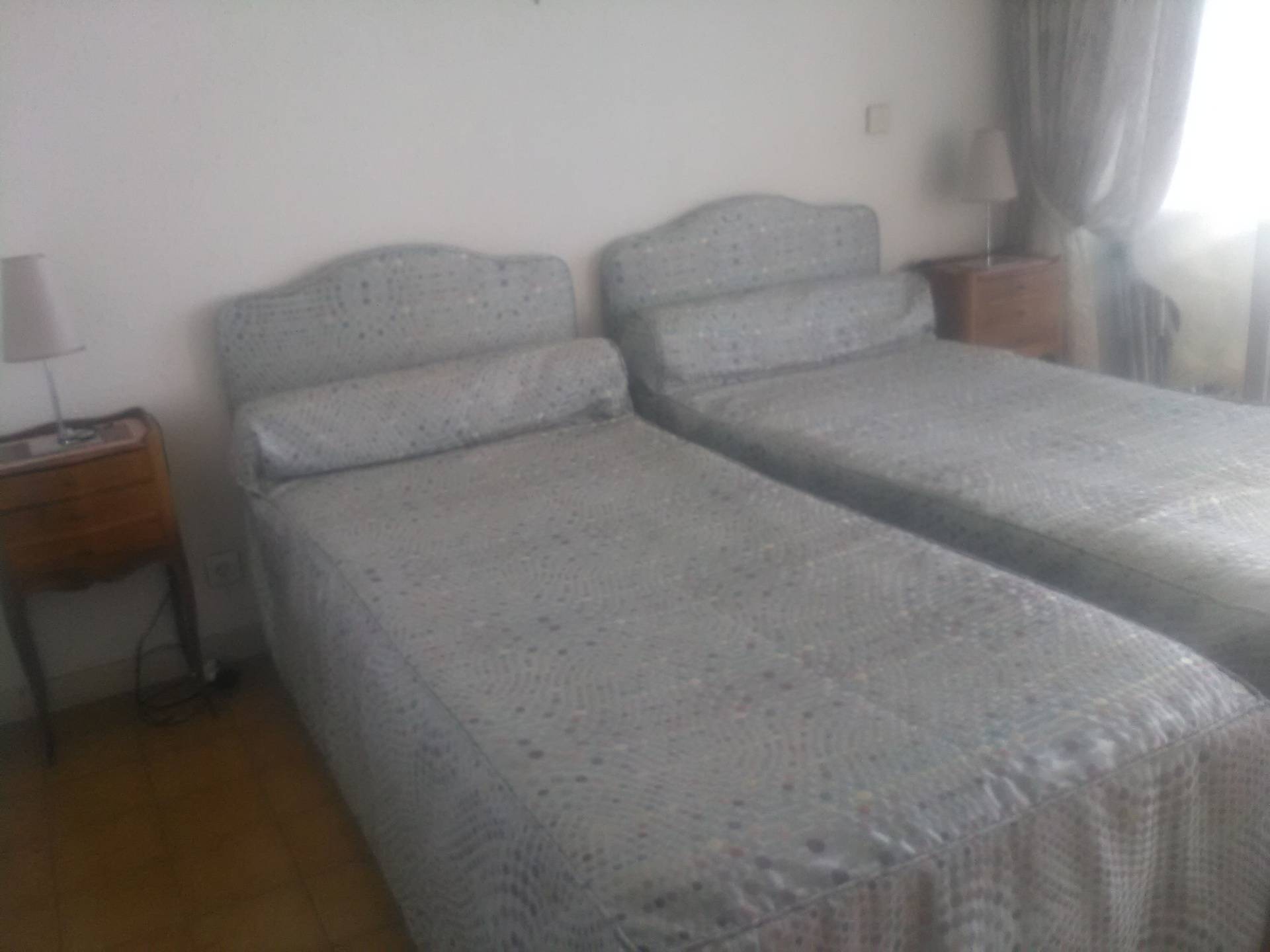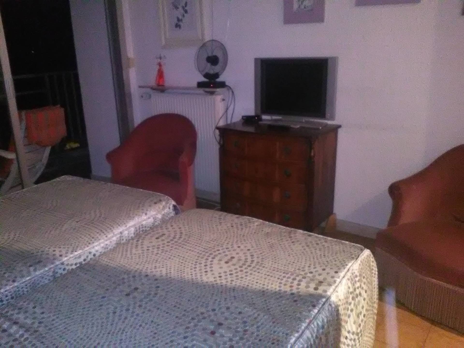 Chambre avec 2 lits simples avec placards, une commode et petite tv, donnant sur la terrasse avec vue sur la mer.