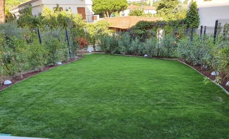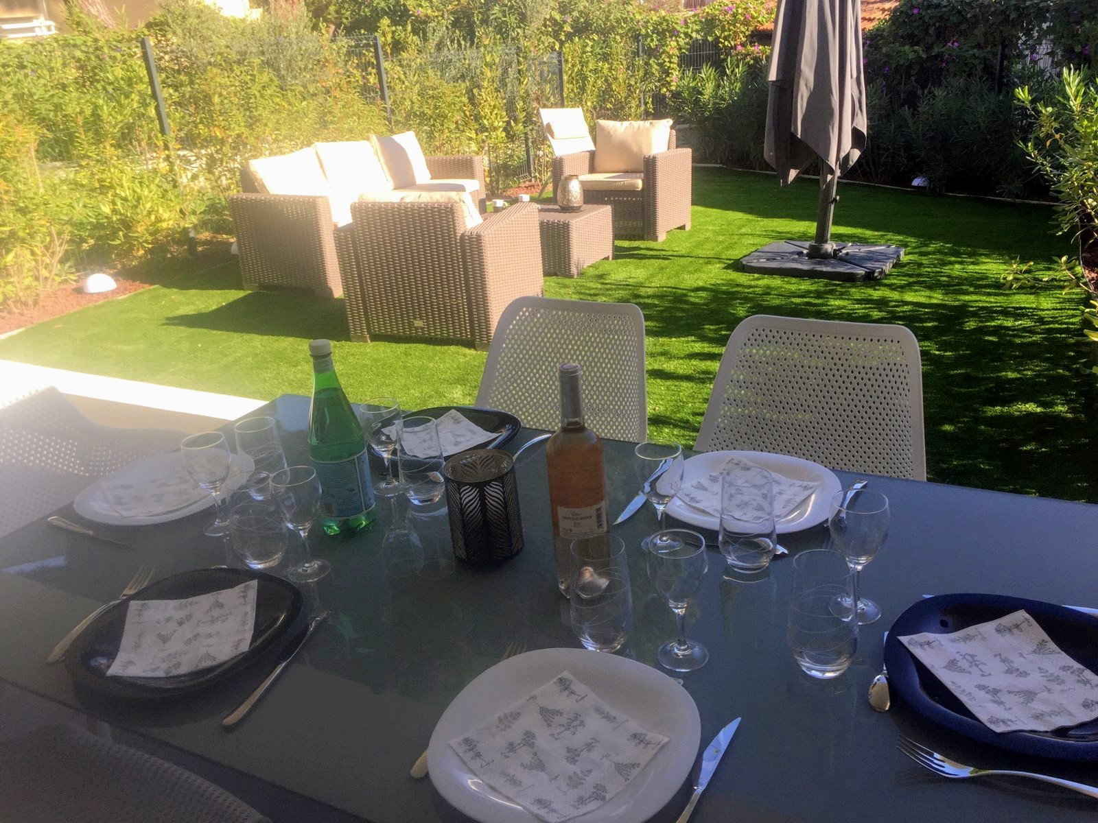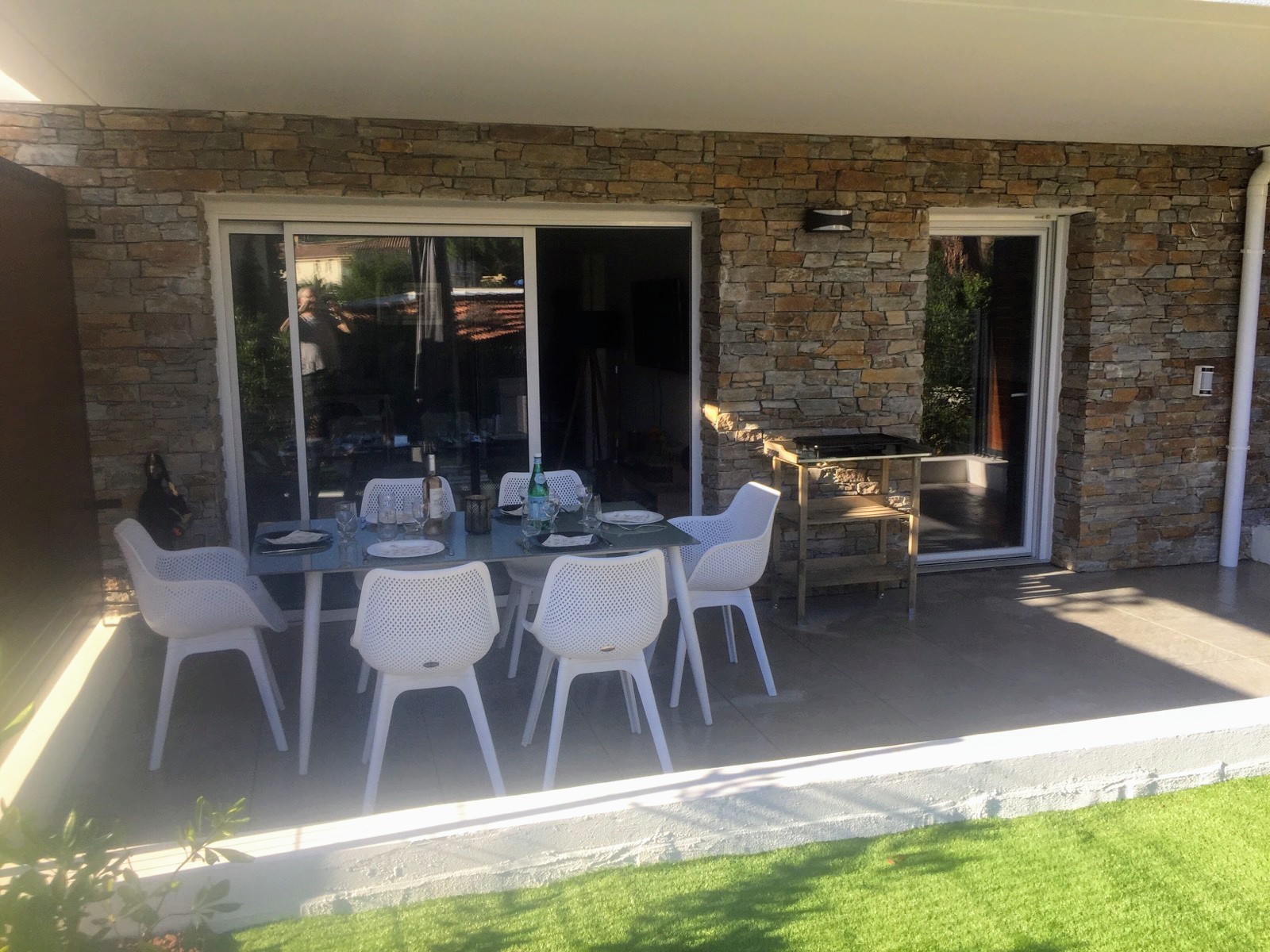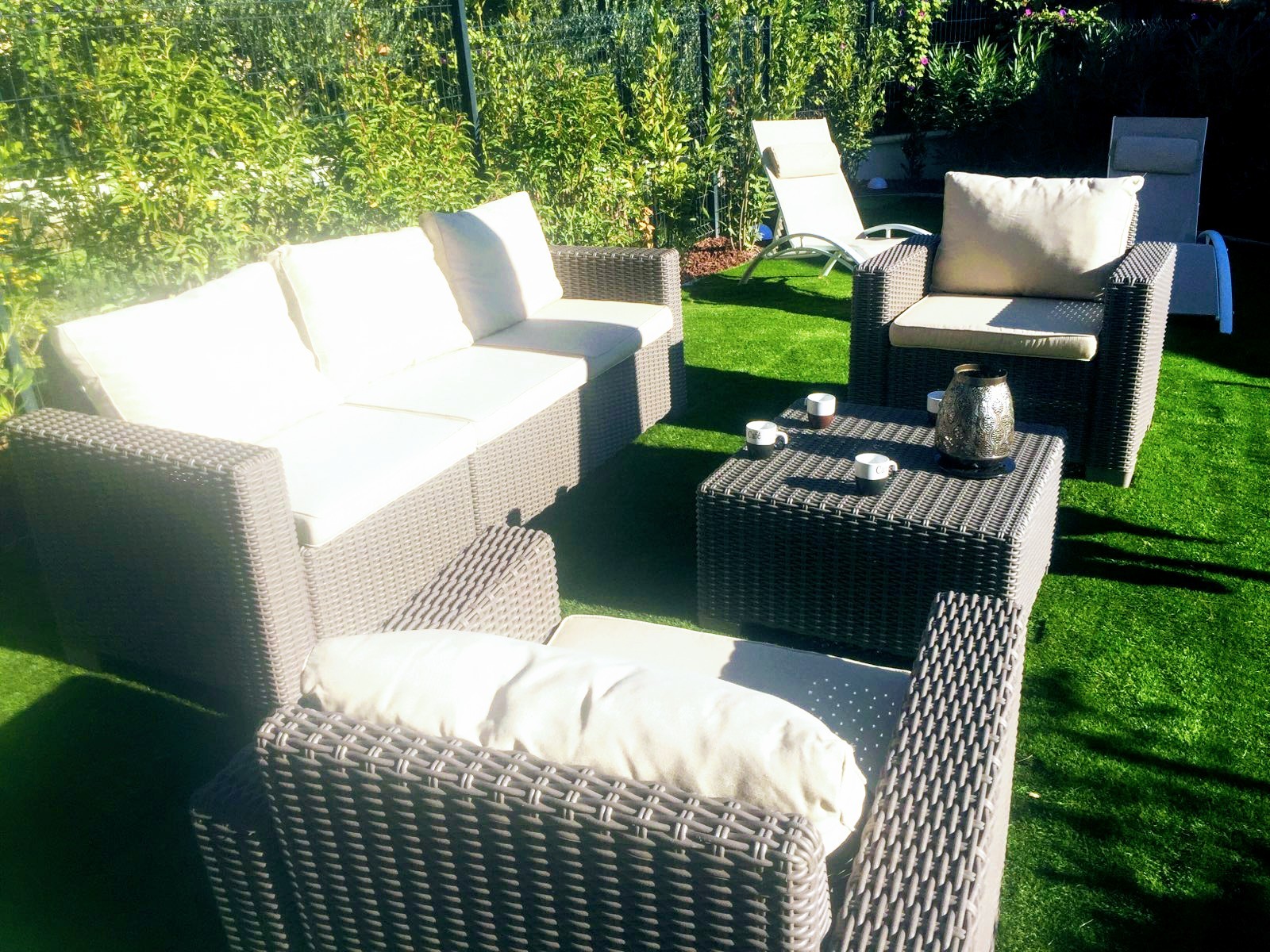 une terrasse de 15m² avec son mobilier: table et chaise, salon de jardin et ses coussins, barbecue et transat