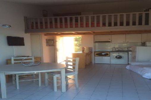 loue à Cavalaire sur Mer appartement de vacances, terrasse vue mer et montagne (massif des Maures), avec piscine privative, terrain de jeux, dans une résidence privée arborée. tout confort: frigo, congélateur machine à laver, télévision,wc indépendant et salle de bain avec baignoire... chambre indépendante avec 2 lits une place superposés, chambre en mézzanine avec lit 2 places, convertible dans le séjour terrasse 8 m2 environ avec transats et table et barbecue. Place de parking numérotée.