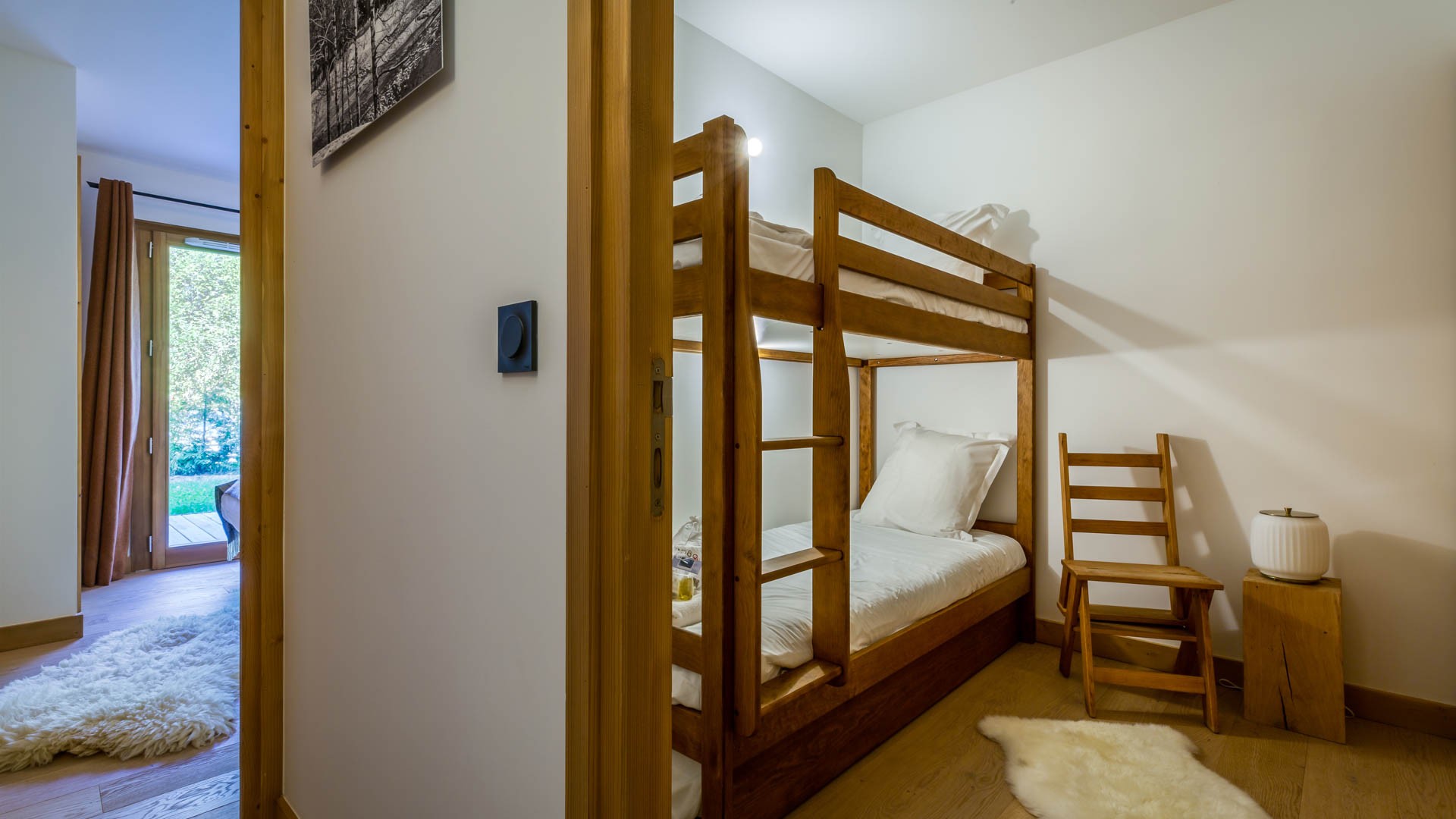 bain, une deuxième chambre double spacieuse et une troisième chambre avec lits superposés se partageant une salle de bain.