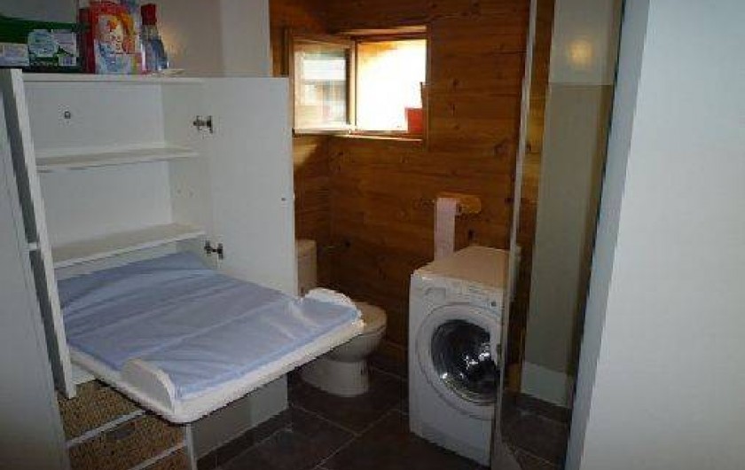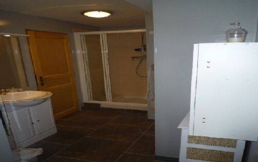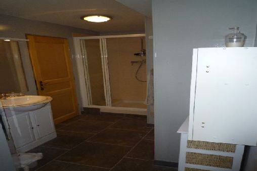 Une grande salle de bain avec douche et wc, ainsi qu'un lave linge séchant.