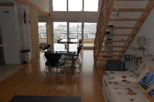 Location d'un loft de 72 m² avec 3 chambres à l'étage, une grande pièce principale, éclairée par deux baies vitrées toute hauteur, avec vue directe sur le port de plaisance, grande terrasse. 2 salles de bains et 2 WC. Cuisine entièrement aménagée. 2 chambres doubles et une chambre avec lits superposés à l'étage.