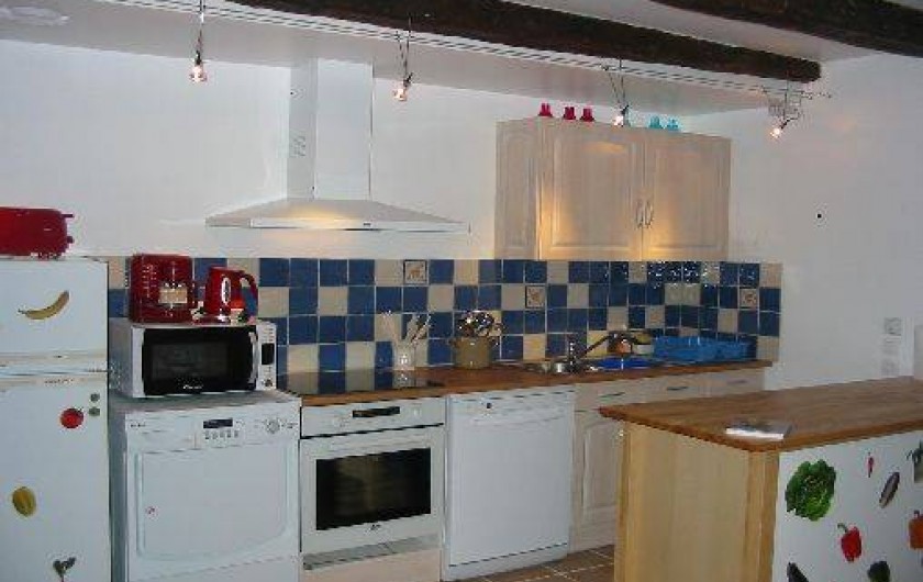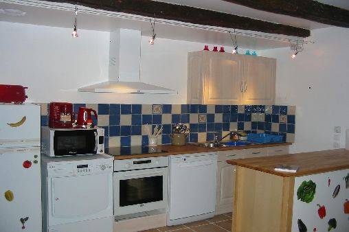 une cuisine toute aménagée : évier 2 bacs, plaque vitrocéramique (4), four, bouilloire, cafetière électrique, grille pains, micro-onde, frigo avec congélateur, sèche linge.
