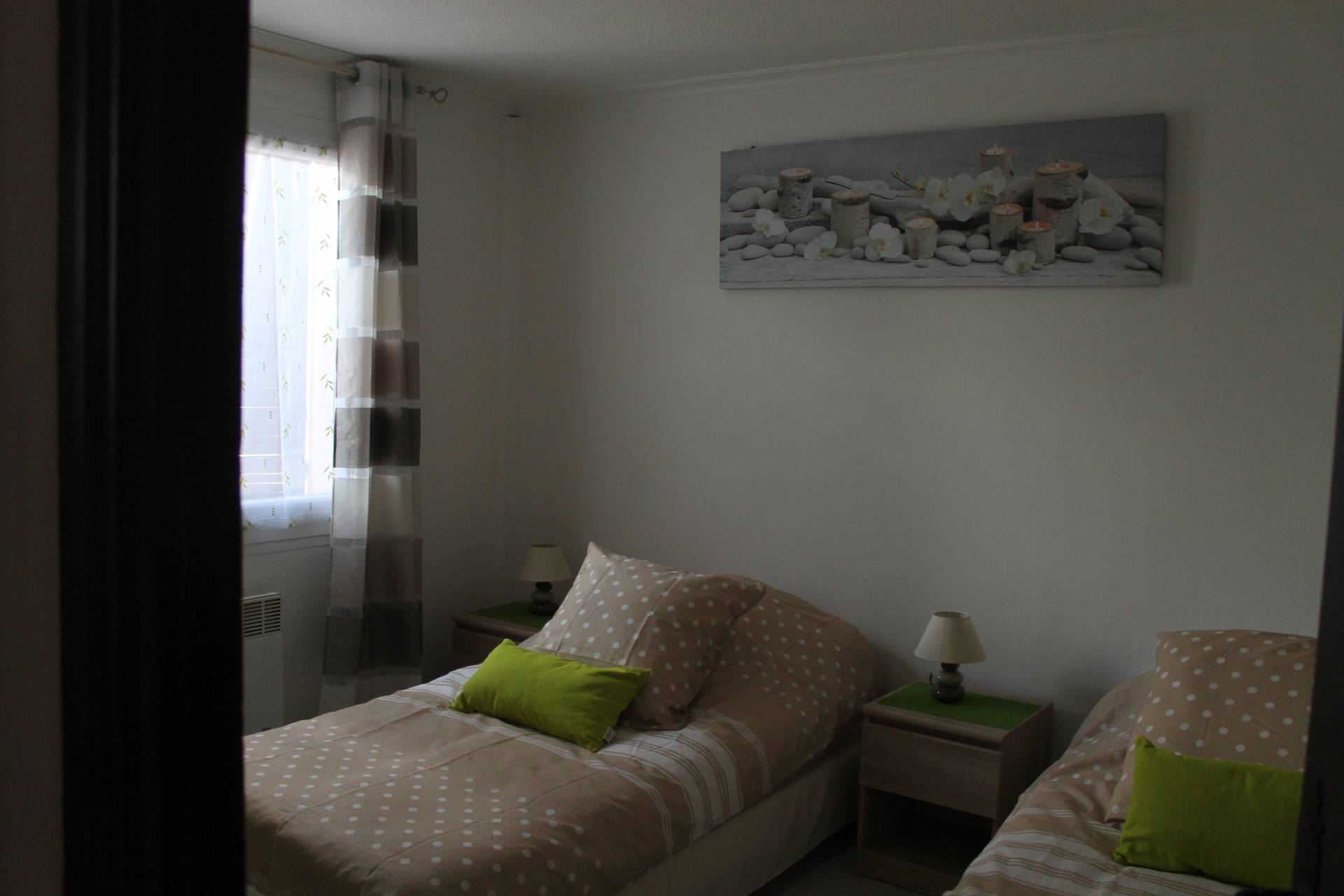 au rez de chaussé, la deuxième chambre avec deux lits simple, 2 chevets, une commode, et un bon gros pouff pour pour lire se détendre.