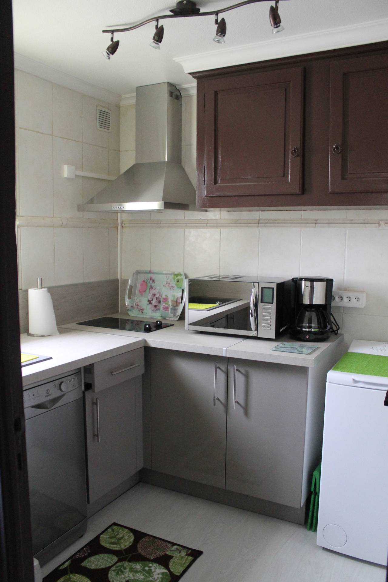 Une cuisine équipée : micro ondes combi, plaque vitro, cafetière filtre, grill pain, bouilloire, lave linge, lave