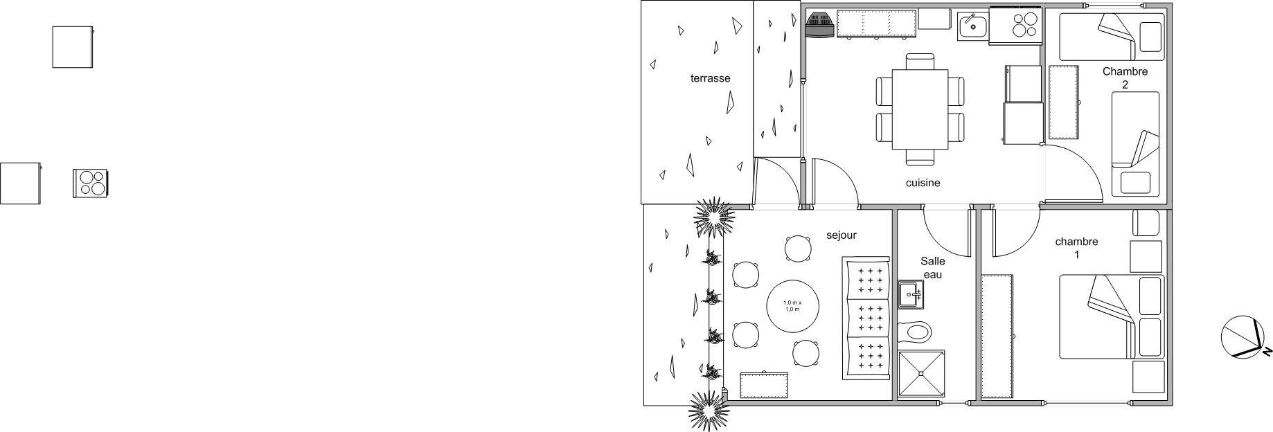 1 cuisine équipée d’un meuble bahut en bois, d’un table avec 4 chaises, d’un meuble évier en acier inox équipé de plaques de cuisson électriques avec placard de rangement bois en sous face, 1 réfrigérateur congélateur, 1 four micro-ondes, 1 four électrique , 1 ventilateur