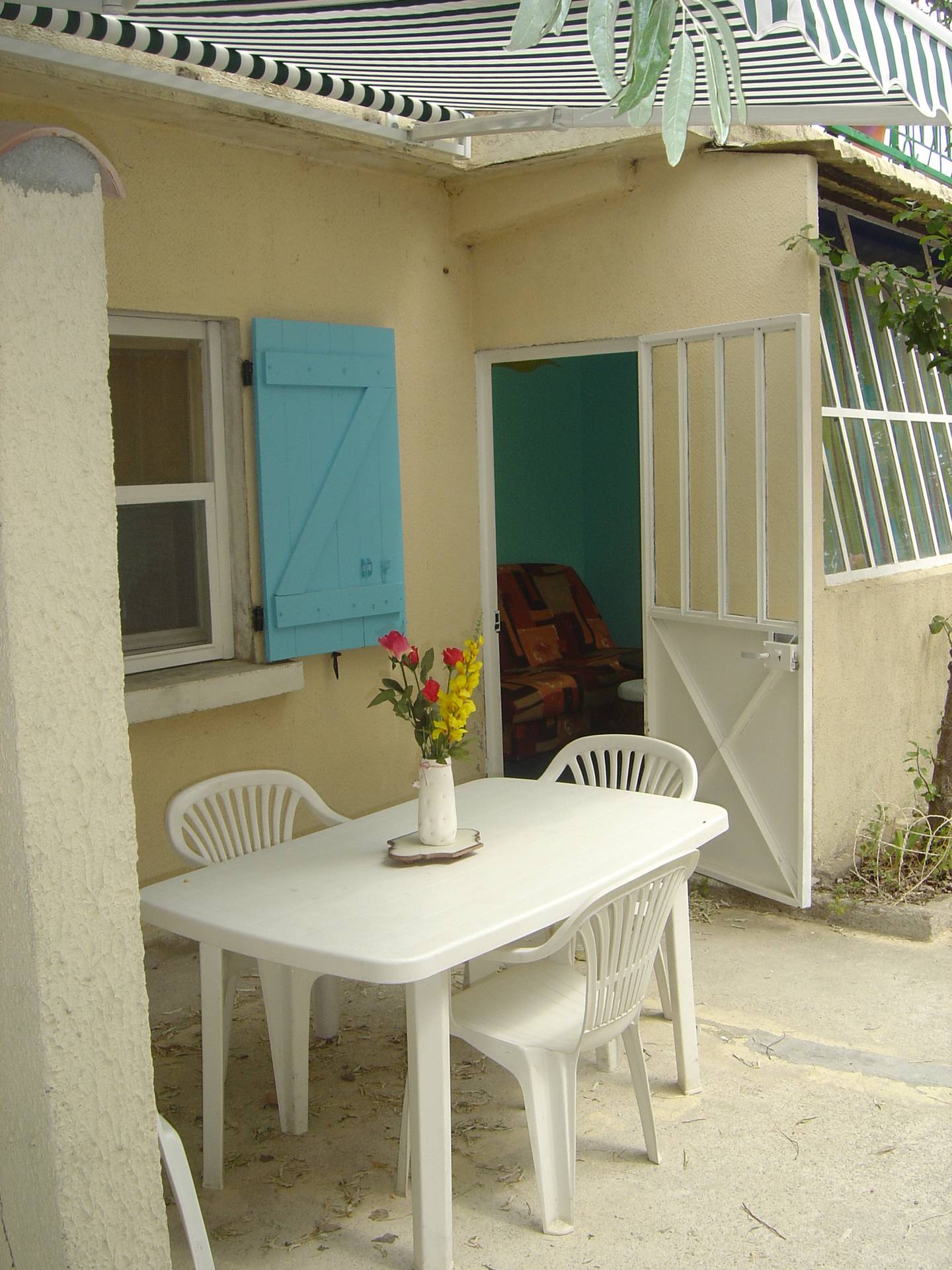 1 terrasse protégée par un store pourvue d’une table pvc et de 4 chaises