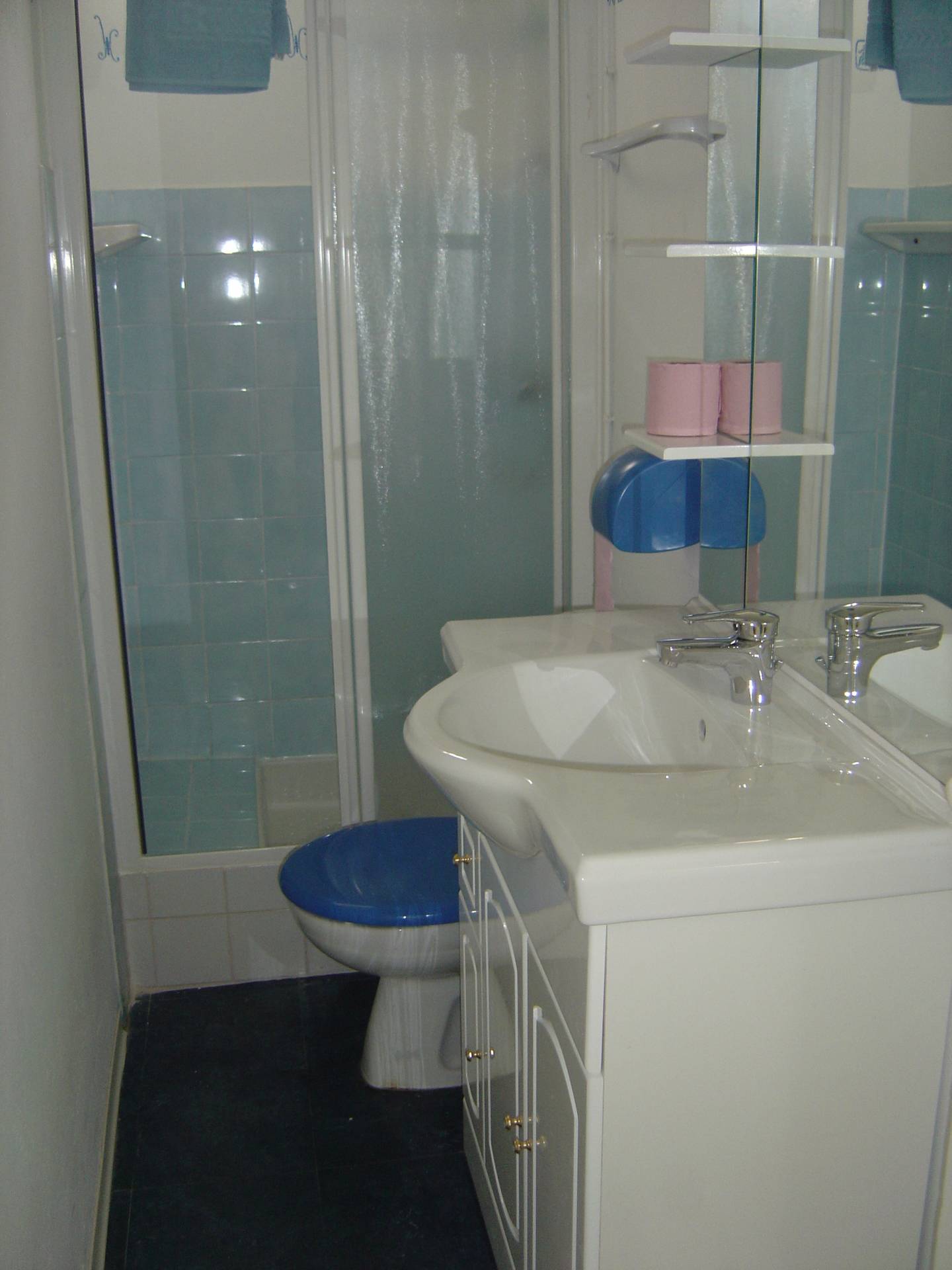 1 salle d’eau avec 1 douche, 1 WC chasse attenante, 1 meuble toilettes avec rangement et miroir