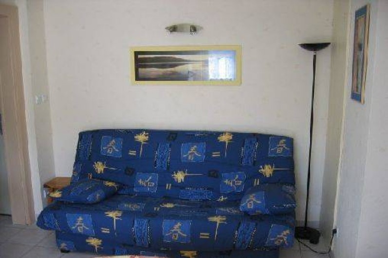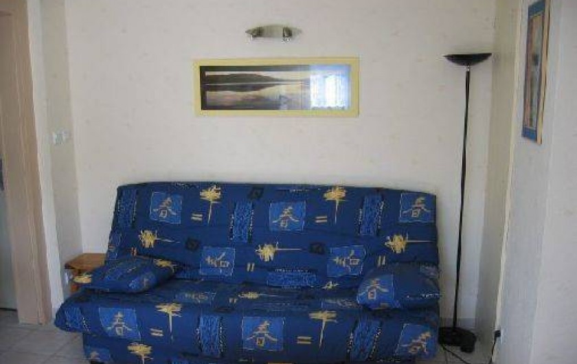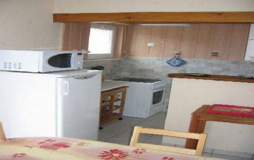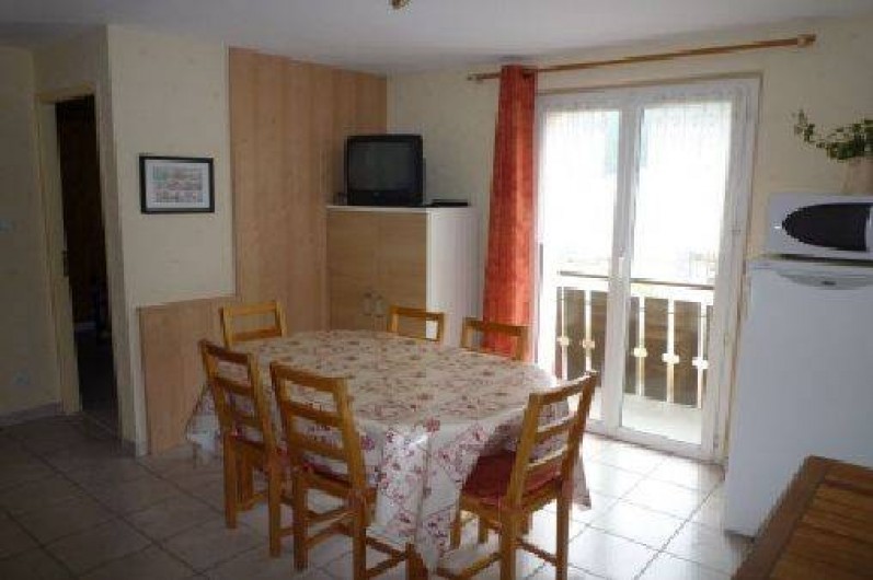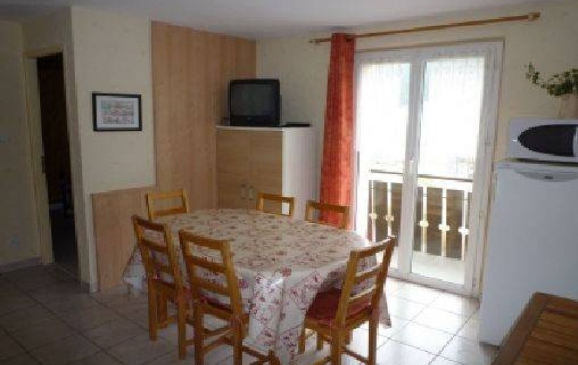 * Une pièce de vie avec cuisine intégrée, un clic clac (2 personnes) mousse 30kg/m3, table et chaises, meuble avec télé avec accès sur le balcon et