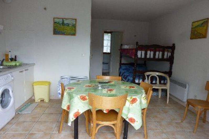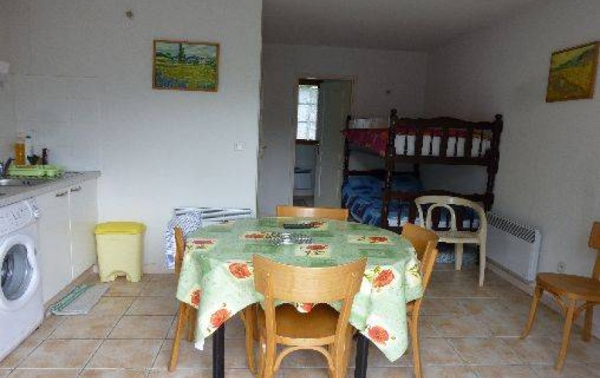 le logement comprend une pièce à vivre, avec une table ronde 6 chaises bois, deux fauteuils de jardin et un clic clac relax ,