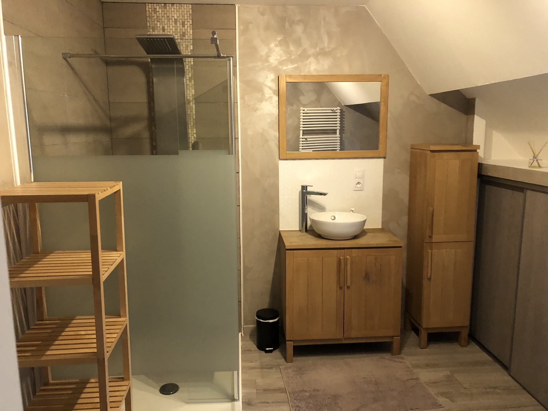 Grande pièce à vivre avec cuisine équipée ouverte ( plaques induction, frigo / congélateur , four micro-ondes, four, hotte, cafetière programmable , Senséo, bouilloire électrique, grill croque monsieur ,raclette pierrade, vaisselle pour 4 personnes, ustensiles de cuisine.
