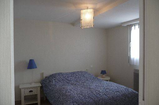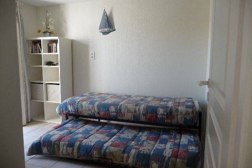 côté mer : chambre 1 (lit de 140) et salon avec banquette convertible.