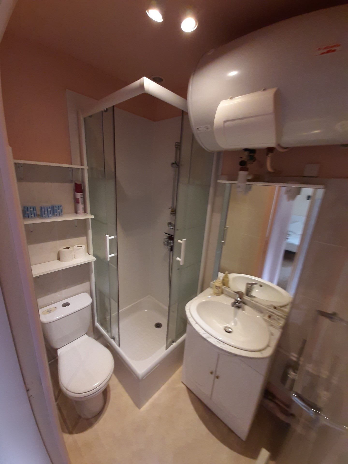 Une salle de bain avec cabine de douche, vasque sur meuble , WC,