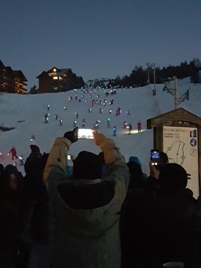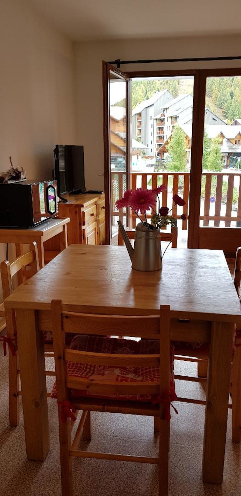 Ensuite un grand balcon (une petite table et deux chaises rangés dans l'appartement sont à installer sur le balcon) avec une superbe vue sur les pistes, la montagne et sur le cœur de la station.