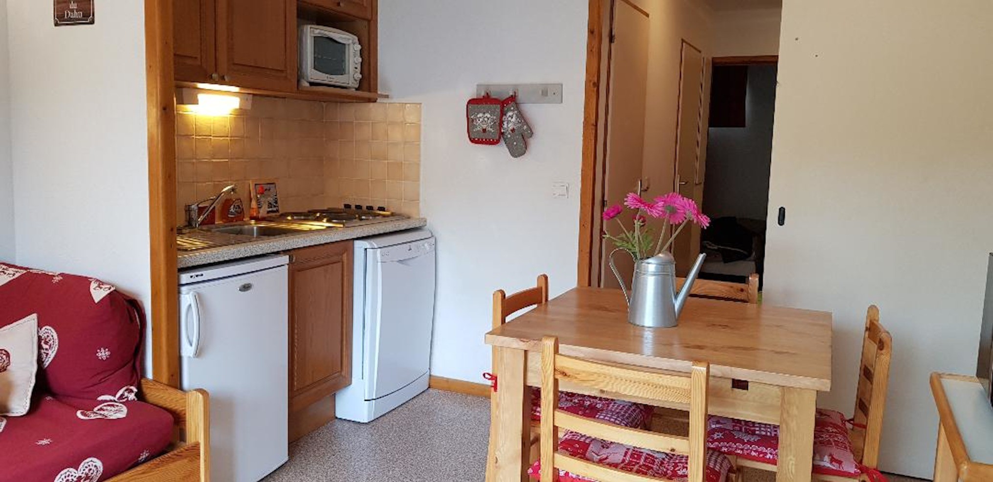 La cuisine est entièrement équipée avec kitchenette dont 2 plaques chauffantes, réfrigérateur, four, four micro-ondes, lave-vaisselle, appareil à raclette, aspirateur. Puis le coin repas et des lits gigognes (pour deux personnes).
