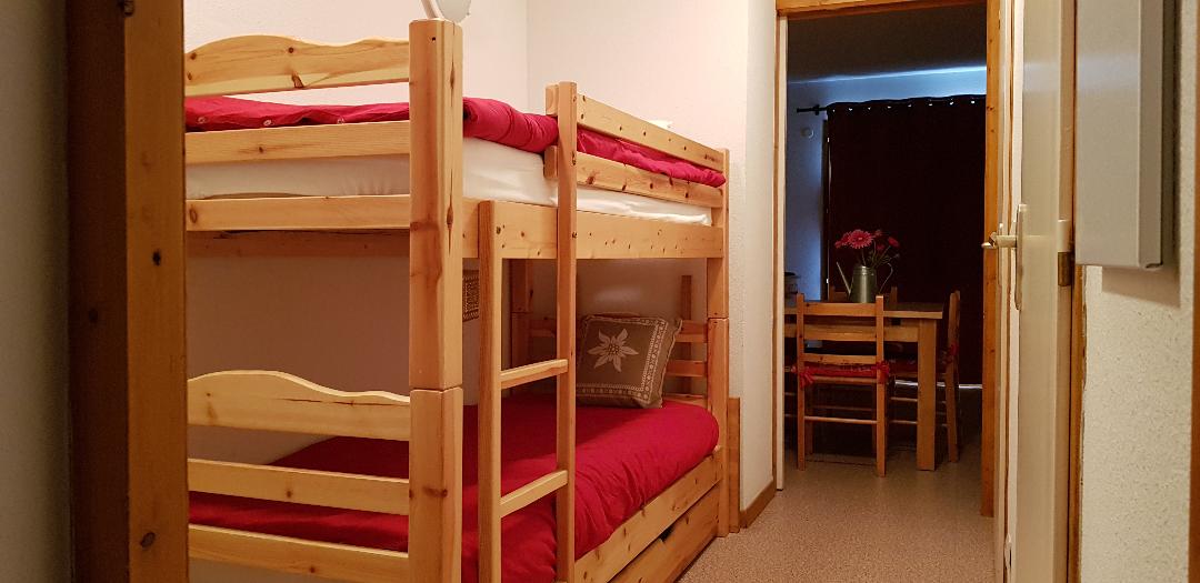 La chambre est équipée d’un lit très confortable (120x190 cm) et de placards muraux, ensuite, dans l’entrée un ensemble de deux lits superposés.